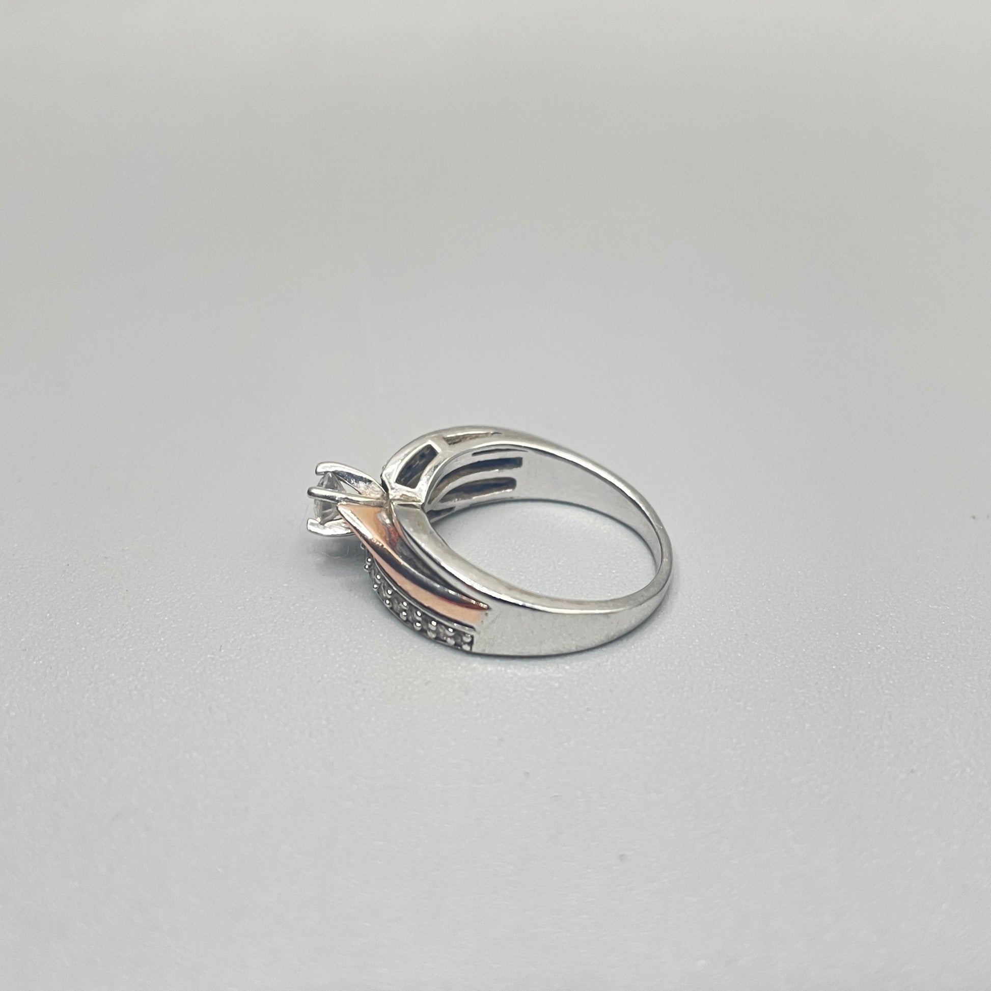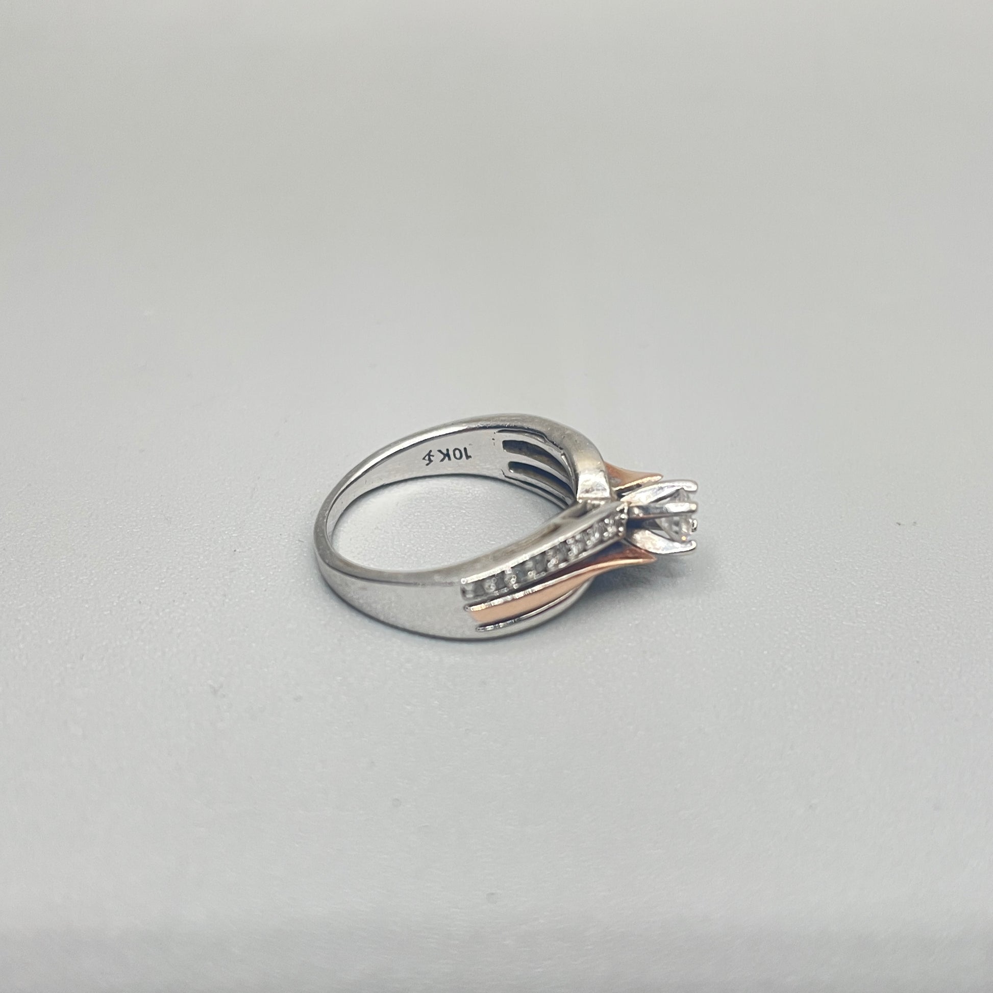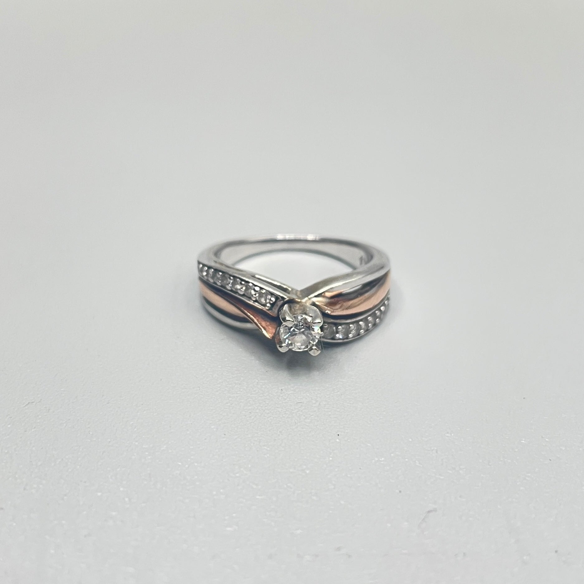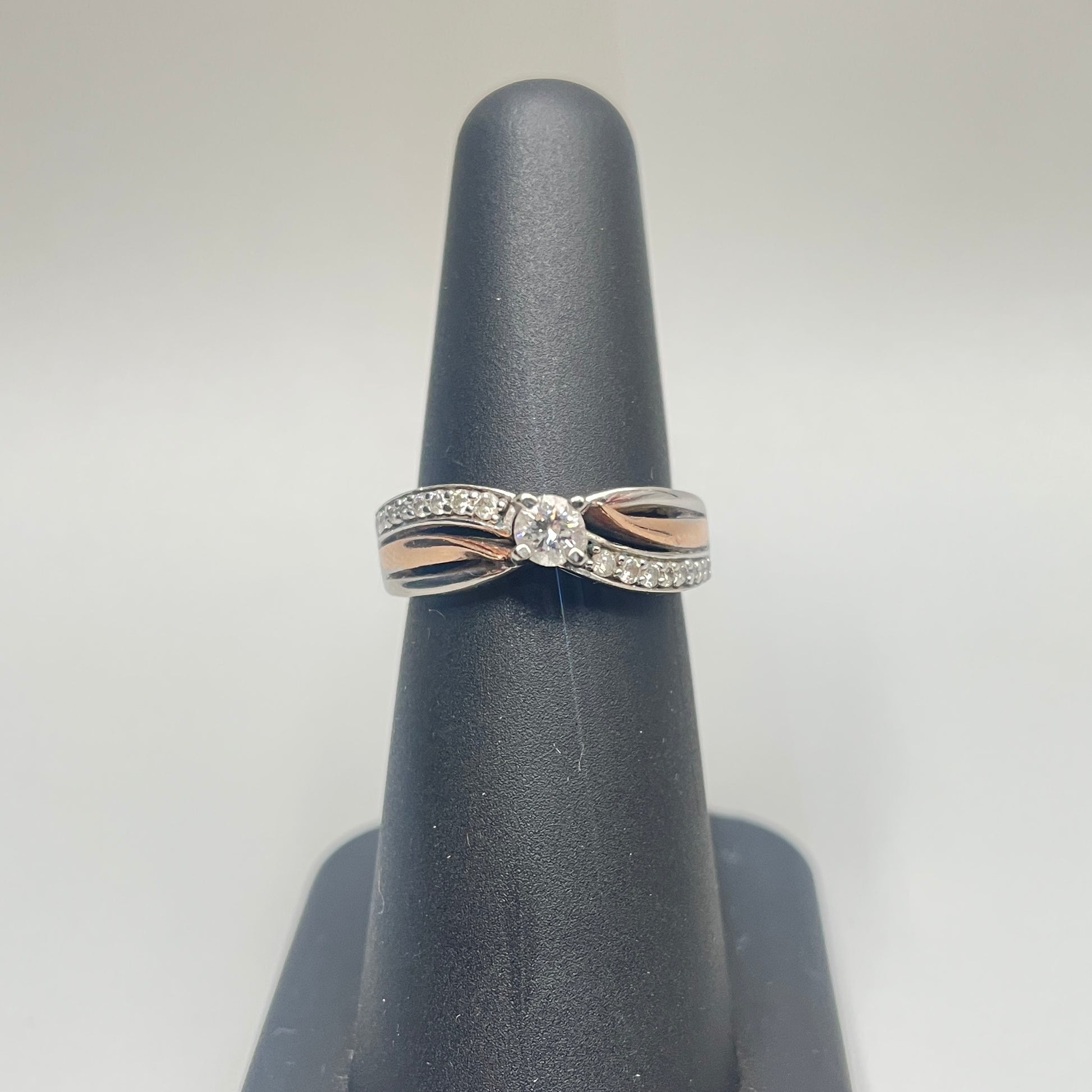 Up for sale, we have a lovely pre-owned 10K Two Tone Gold Diamond Engagement Ring (0.31 CTW) (Size 5) for sale. The ring has been cleaned and polished to make it look as good as it can be. It boasts 16 round brilliant cut diamonds, each approximately 0.01cts, with a color/clarity of G-H/SI1, and a center round brilliant cut diamond that measures at 0.15cts with a color/clarity of G-H/I2. The pictures provided showcase the cosmetic details of the item you are purchasing. And the best part? You can take advantage of our layaway plan with a 30% deposit. Contact us for further information. Visit us in-store during regular business hours to make your purchase.