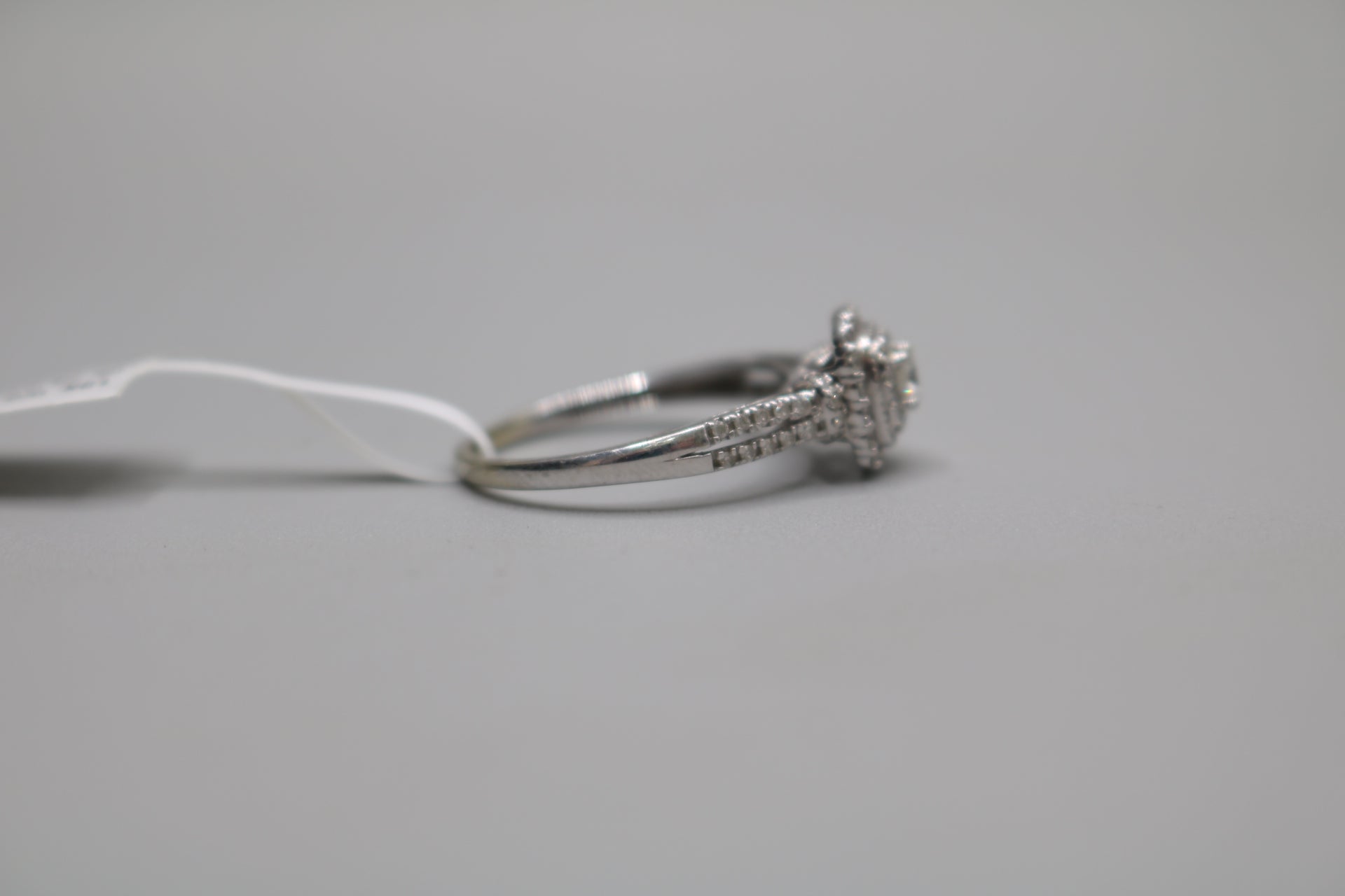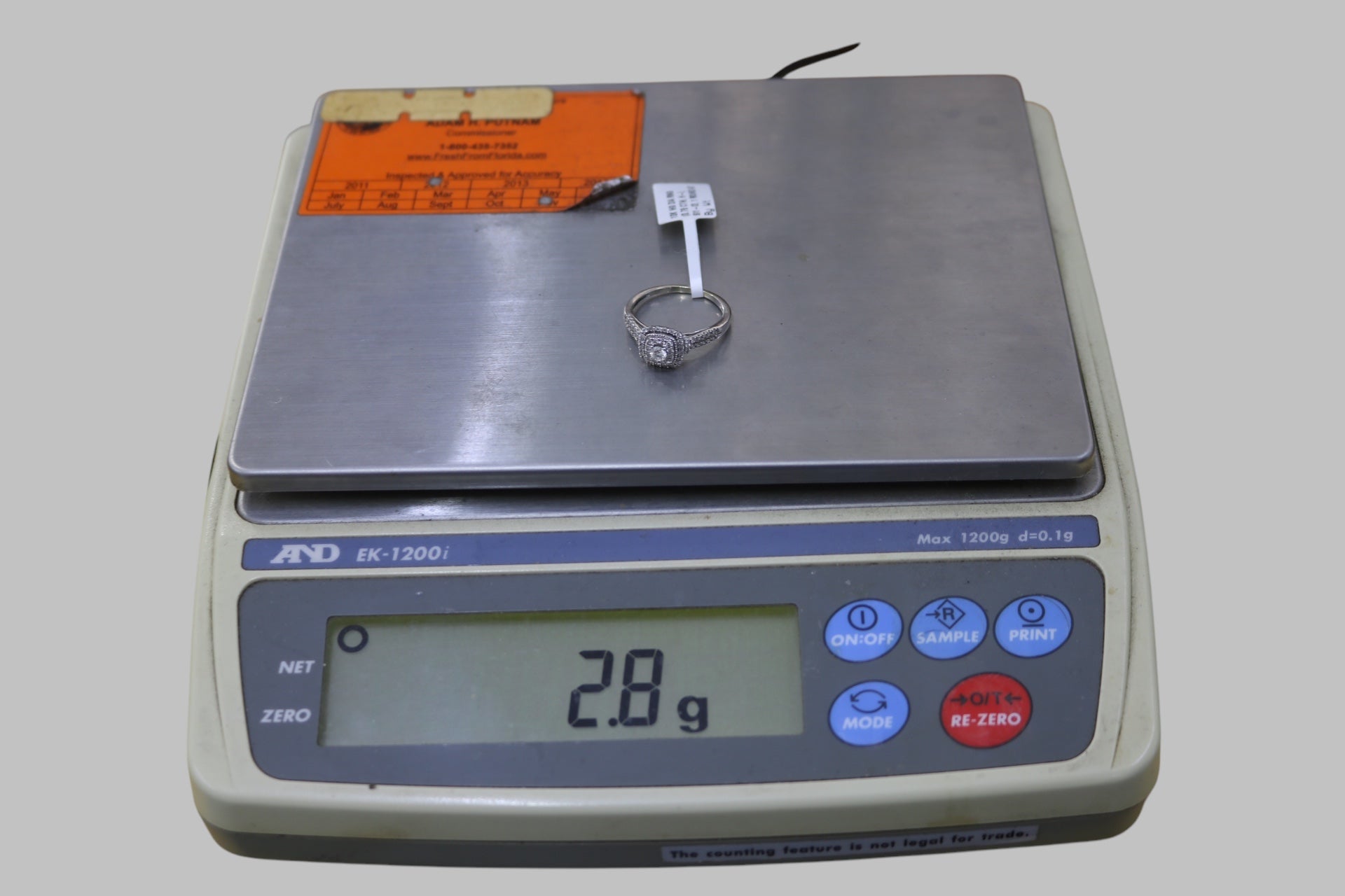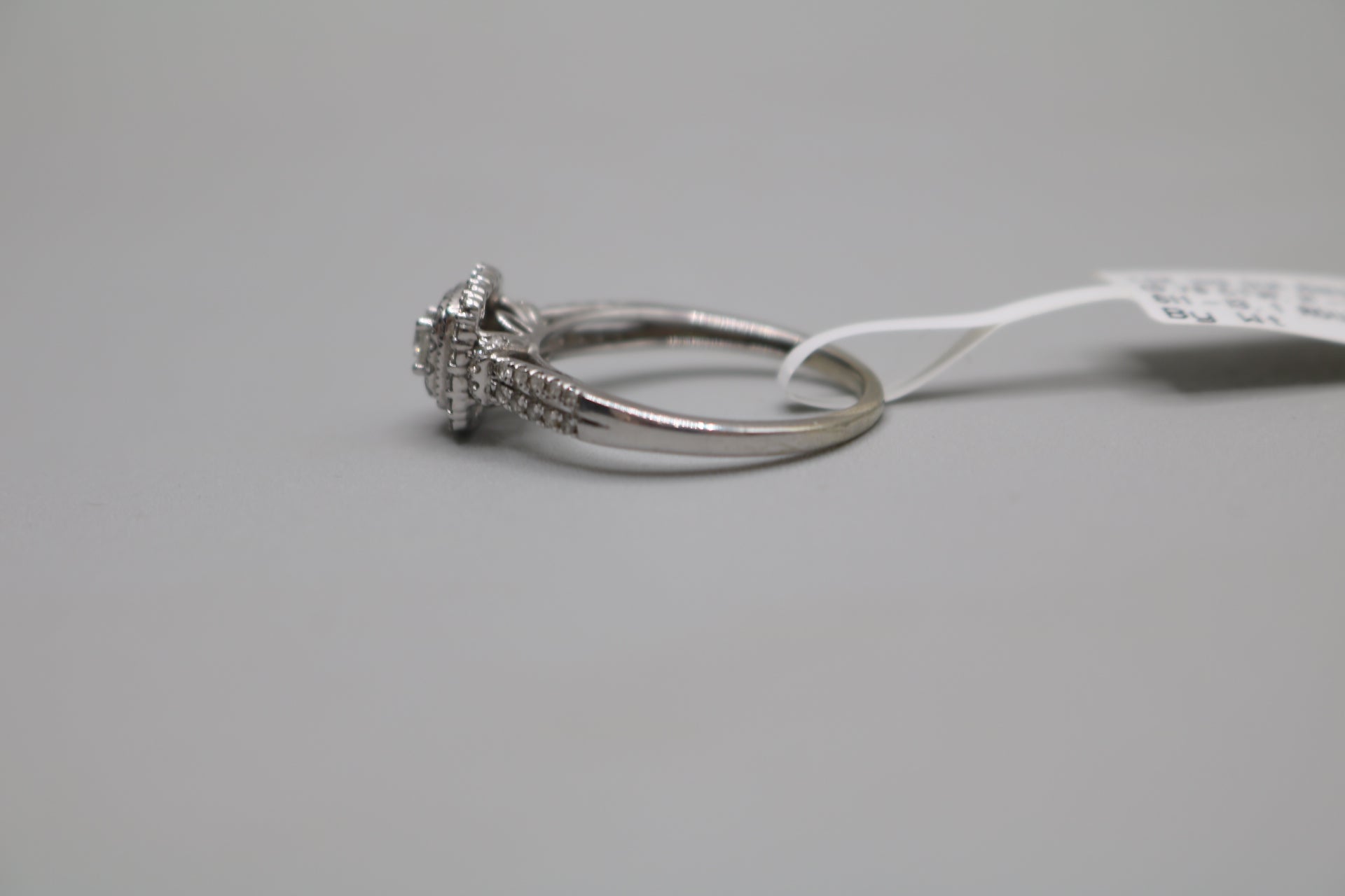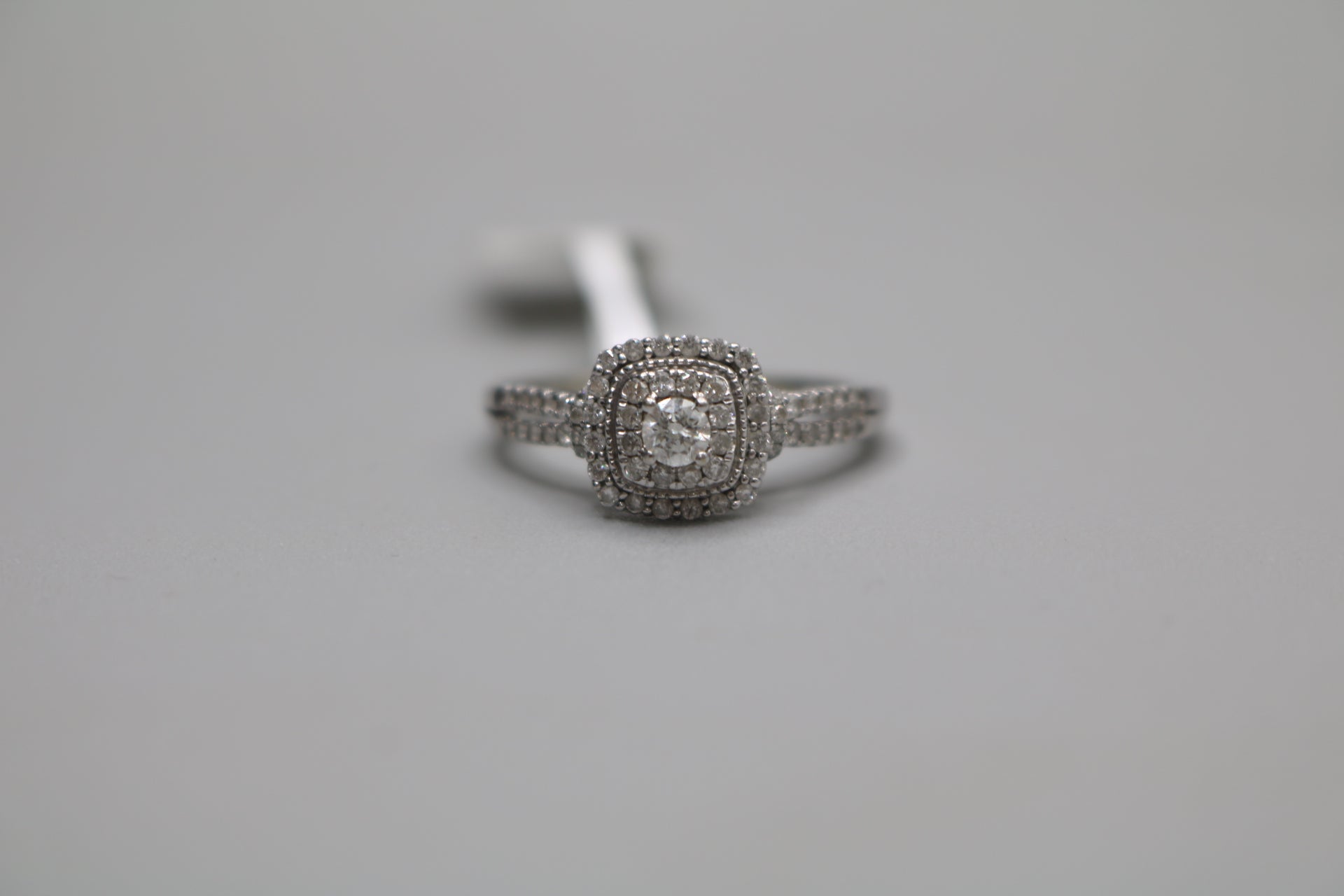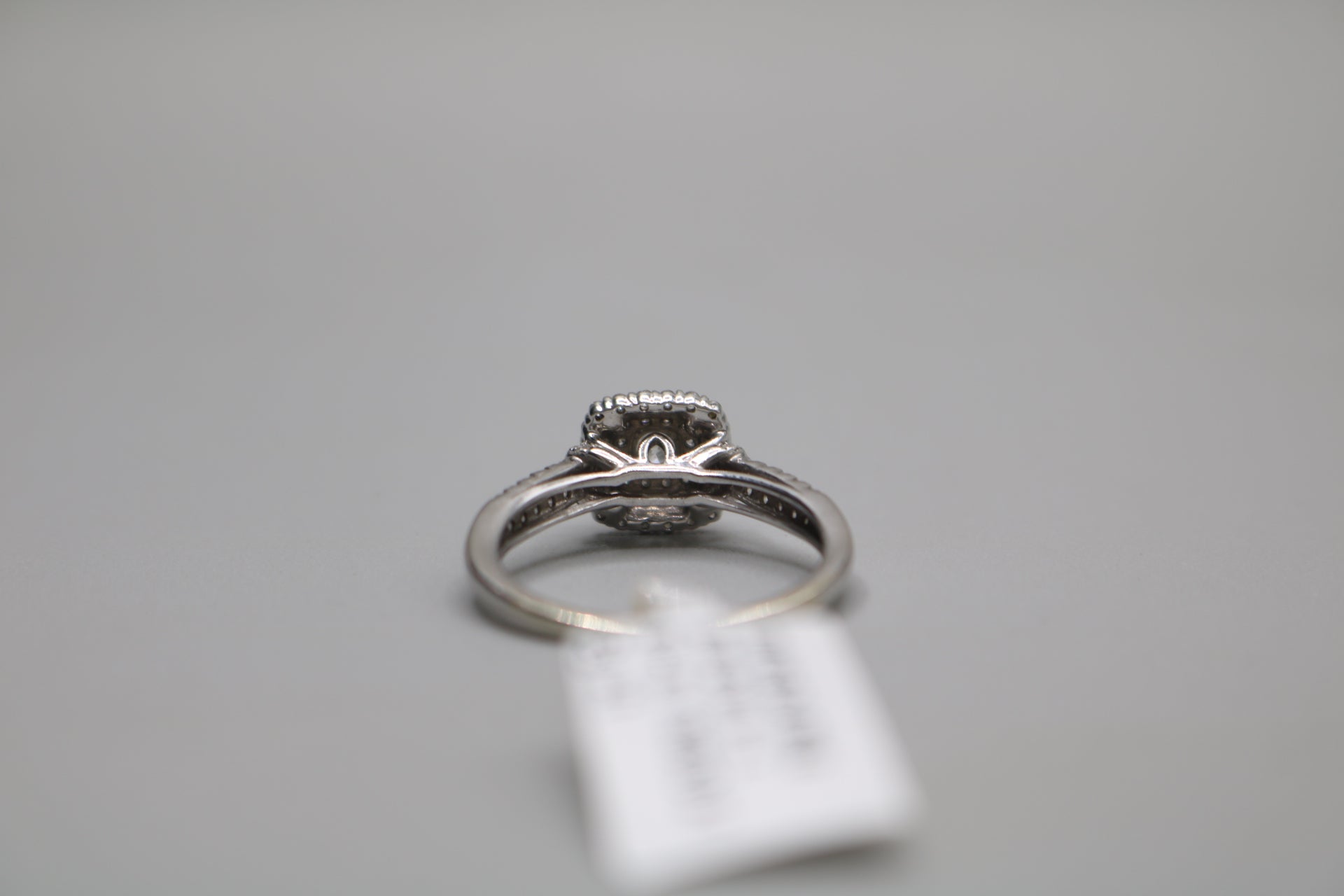 Check out this stunning pre-owned 10K White Gold Diamond Engagement Ring (Size 8 & 1/2) (0.78 CTW). The ring has 64 round diamonds @0.01cts each, and 1 round diamond @ 0.14cts. The diamonds have a G-H color and SI1 clarity. It weighs 2.8 grams. The ring is also available to put on layaway with a 30% deposit. Contact us for further details. Purchase in-store during regular business hours or online with shipping that includes tracking information. Be sure to examine the pictures for all the cosmetic details before making your purchase.
