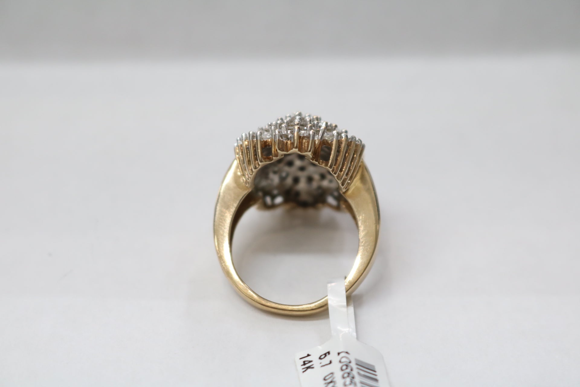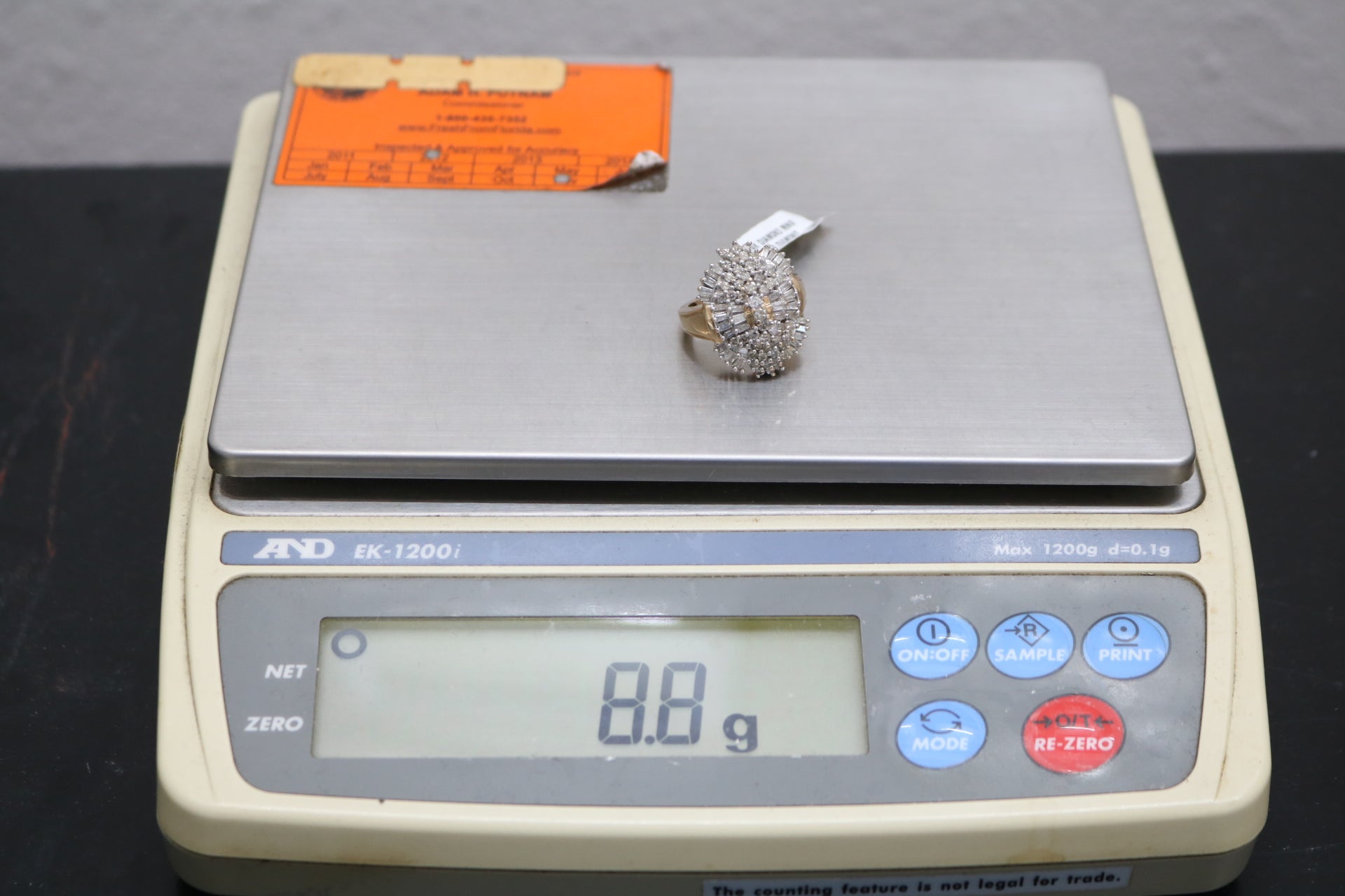 For your consideration, we present an exquisite pre-owned 10K Yellow Gold Diamond Cluster Ring, beautifully crafted and boasting a size 7 (2.00 CTW). This stunning piece weighs 8.8 grams and features an impressive array of 49 round-cut diamonds, each weighing 0.024 carats, alongside 34 baguette-cut diamonds, also 0.024 carats each, for a remarkable total of approximately 2.00 carats. The diamonds' brilliant color and clarity rating of G-H/SI1-S2 ensure a dazzling display of sparkle and sophistication. We invite you to explore the accompanying images carefully to truly appreciate the beauty and craftsmanship of this magnificent ring. To make this treasure yours, we offer an easy layaway plan with just a 30% deposit required. Please note that this elegant piece is available for local pick-up only; shipping is not provided. Don't miss the chance to add this remarkable gem to your collection!
