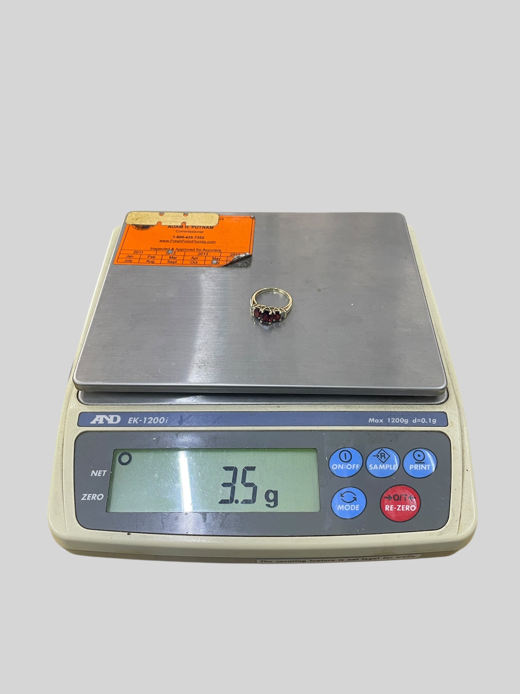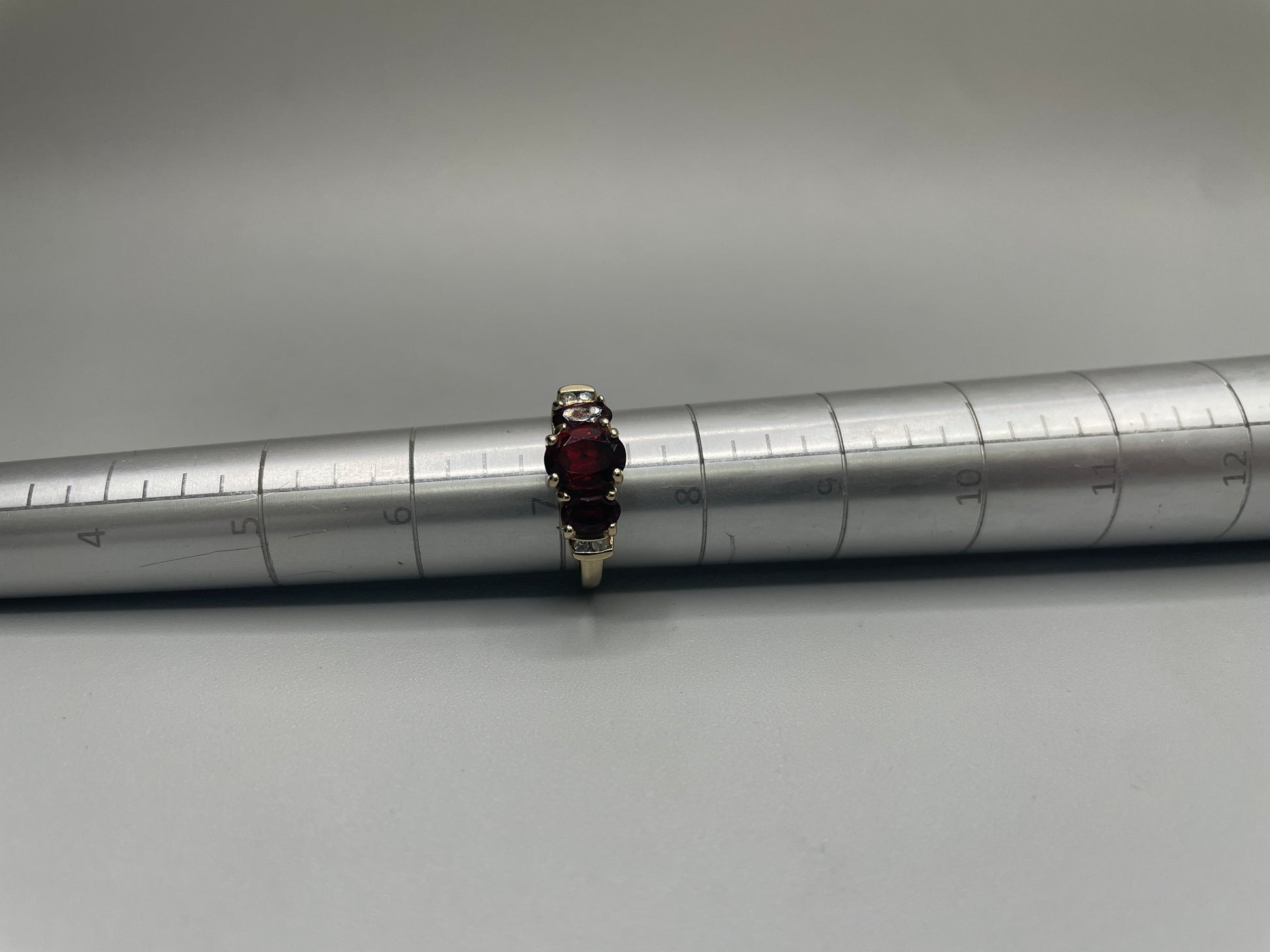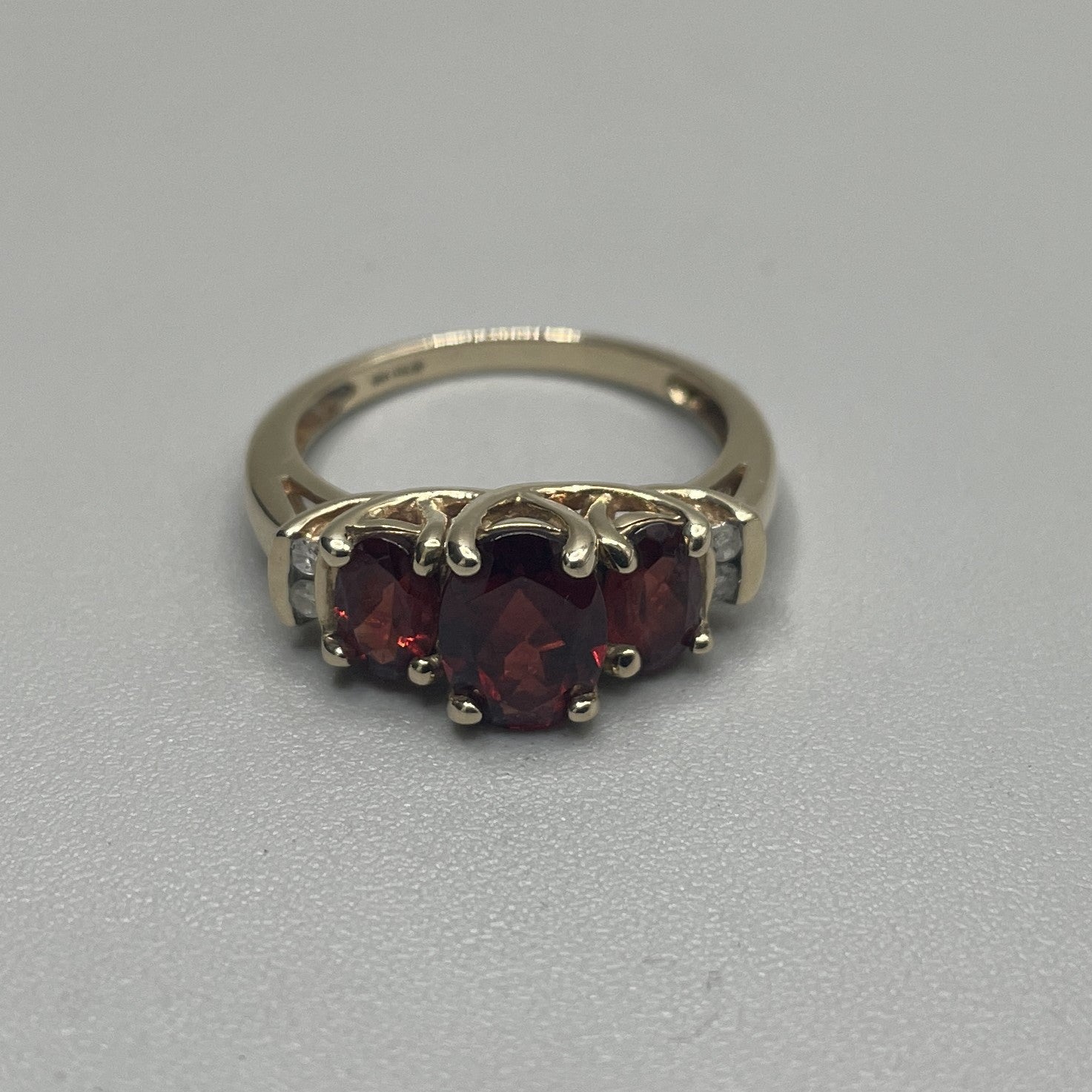 Check out this stunning pre-owned 10K Yellow Gold Garnet & Diamond Ring (Diamond 0.08 CTW) (Size 7 1/4). It has been professionally cleaned and polished and weighs 3.5 grams. The ring showcases 4 beautiful round-cut diamonds (4 @ 0.02cts each) with a color of G-H and a clarity of SI-2. The ring also has 3 oval-cut garnet gemstones. Make sure to review all the provided pictures to appreciate this item truly. We also offer a convenient layaway plan with just a 30% deposit. You can purchase the ring during regular business hours or opt for shipping with tracking. For additional information, please contact us.