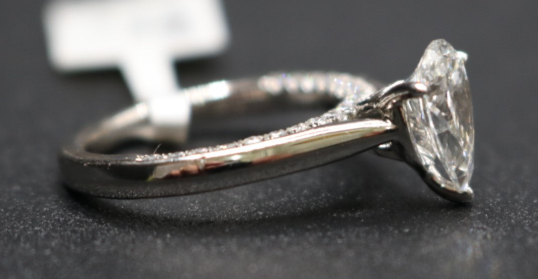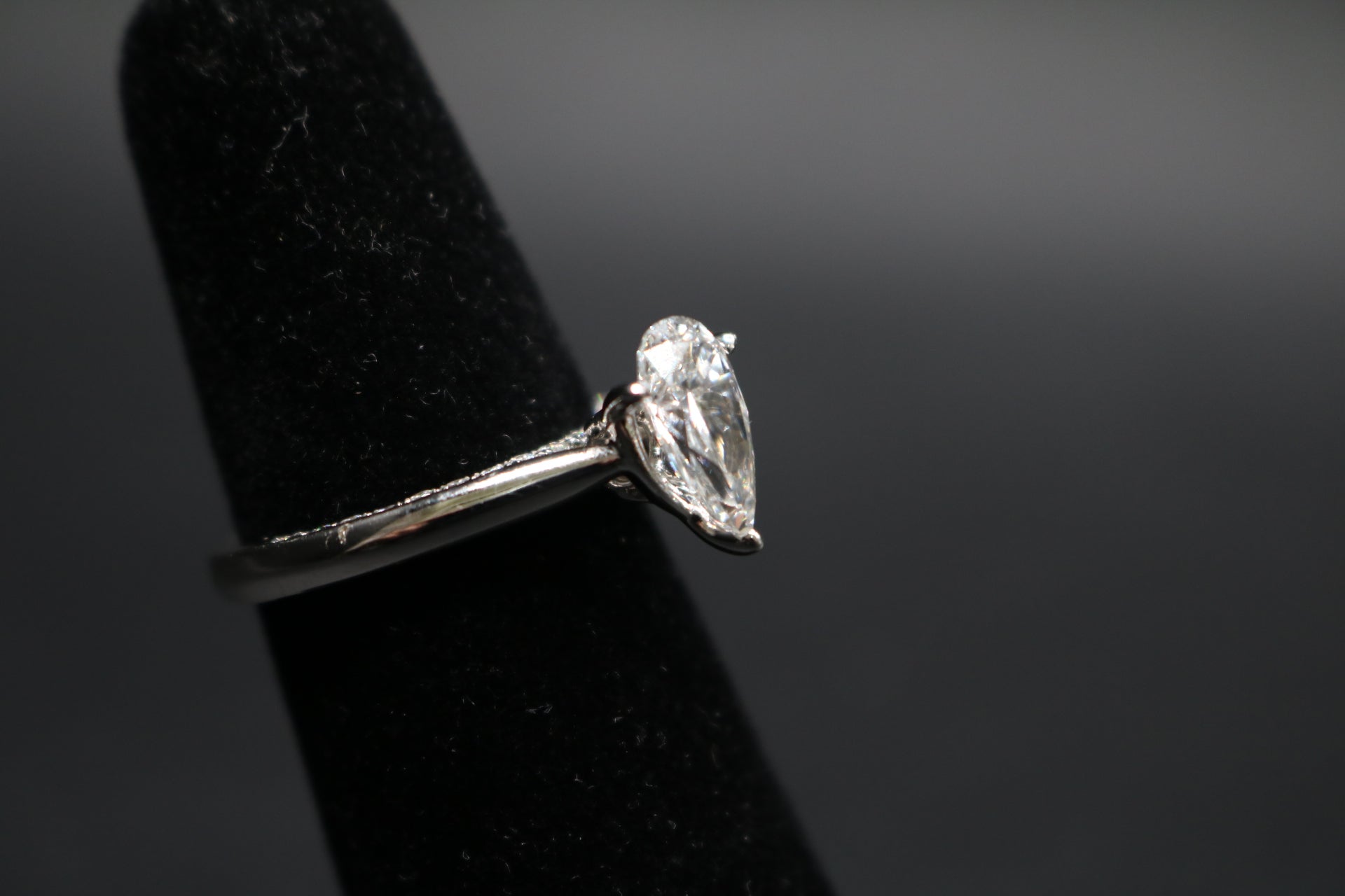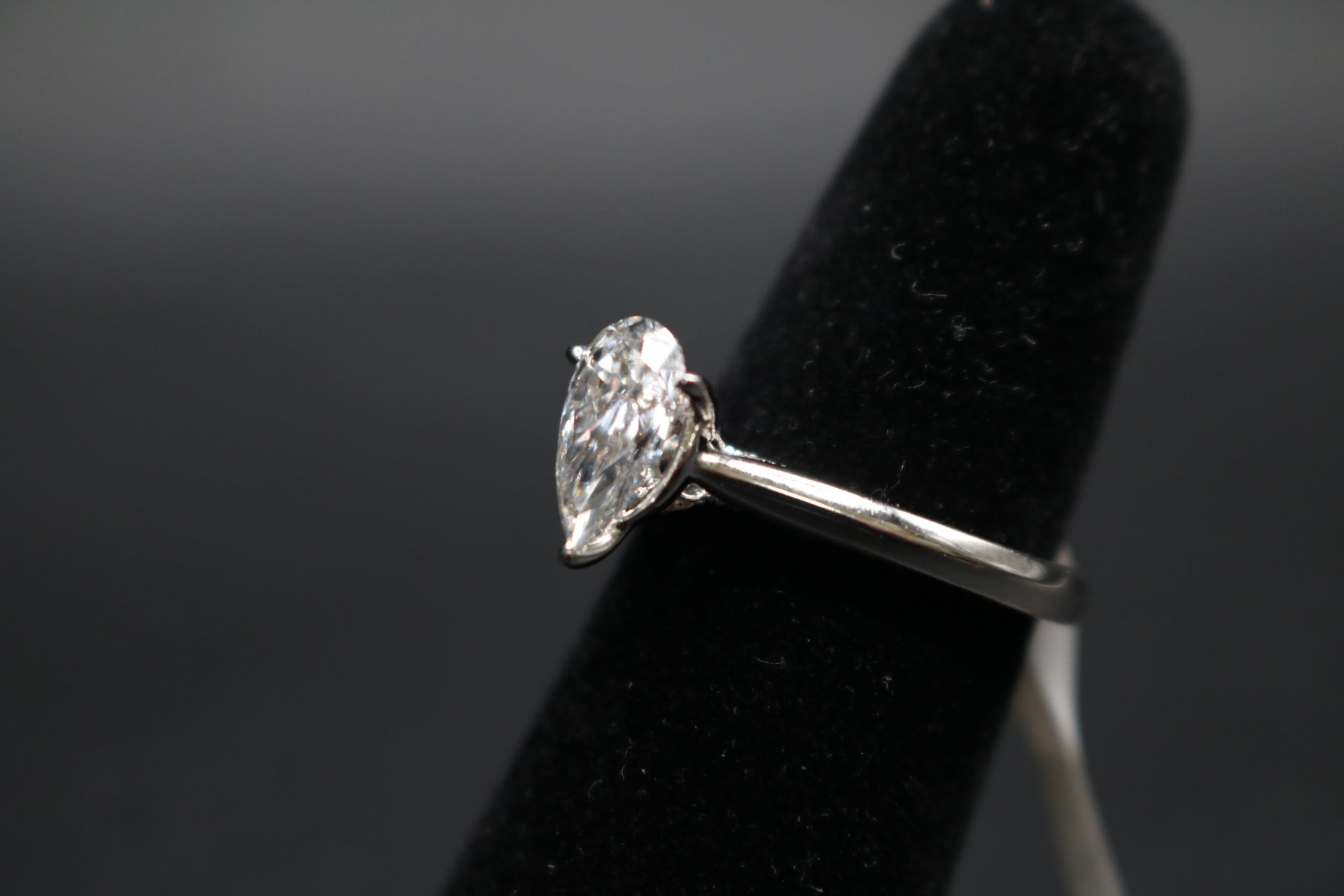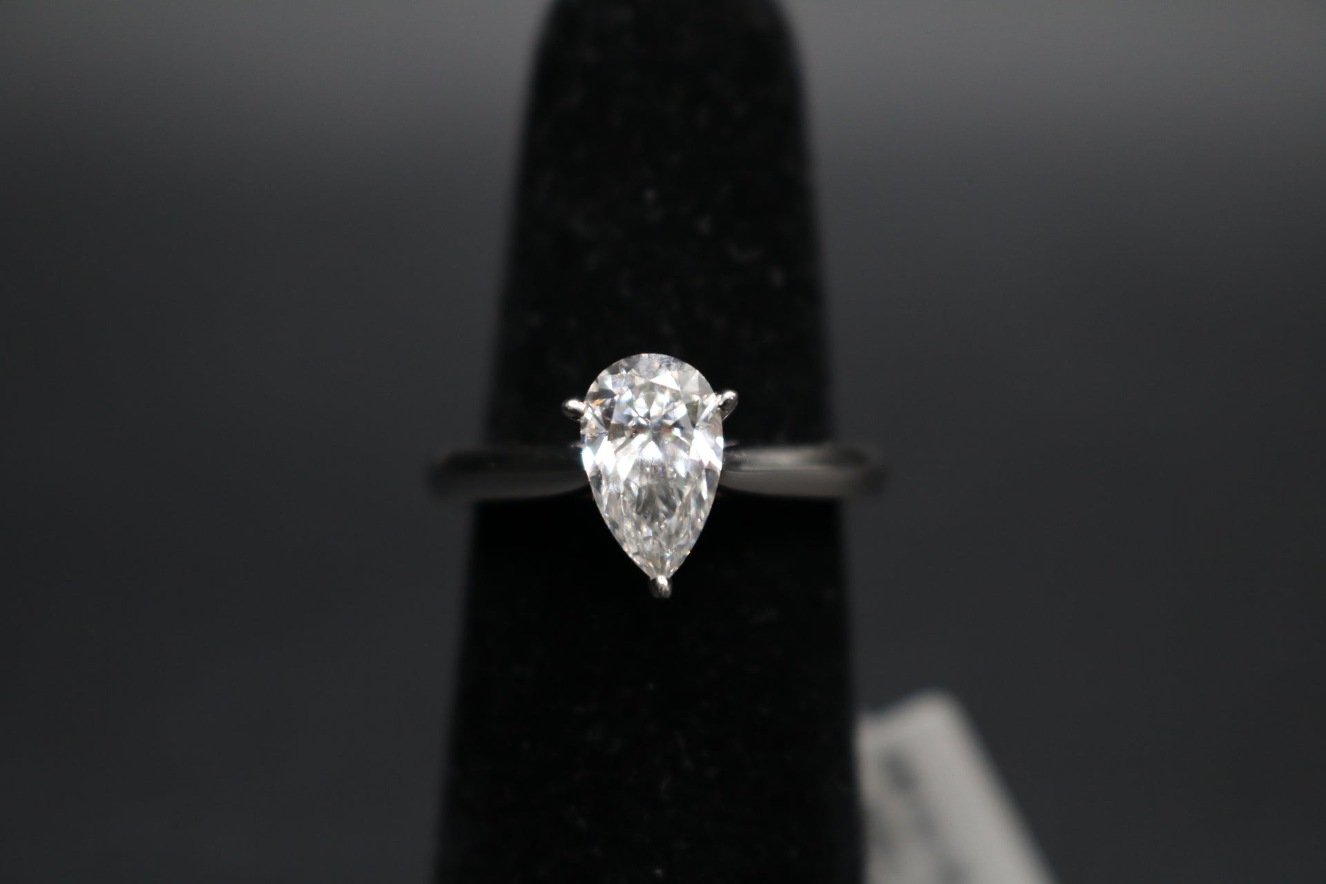 Take a look at this stunning 14K White Gold Lab Grown Diamond Pear-Cut Ring (2.04 CTW) (Size 7) we have for sale! This beautiful ring features 1 pear-cut diamond measuring 1.44 cts and 40 round-cut brilliant diamonds measuring 0.015 cts each. The diamonds boast a color of H-I and a clarity of VVS2. The ring has a weight of 5.3 Grams. Please note that the diamonds on this ring are lab-grown, not natural. This item is available for local pick-up/purchase only. Don't miss the chance to admire this exquisite piece - be sure to check out all the pictures provided!