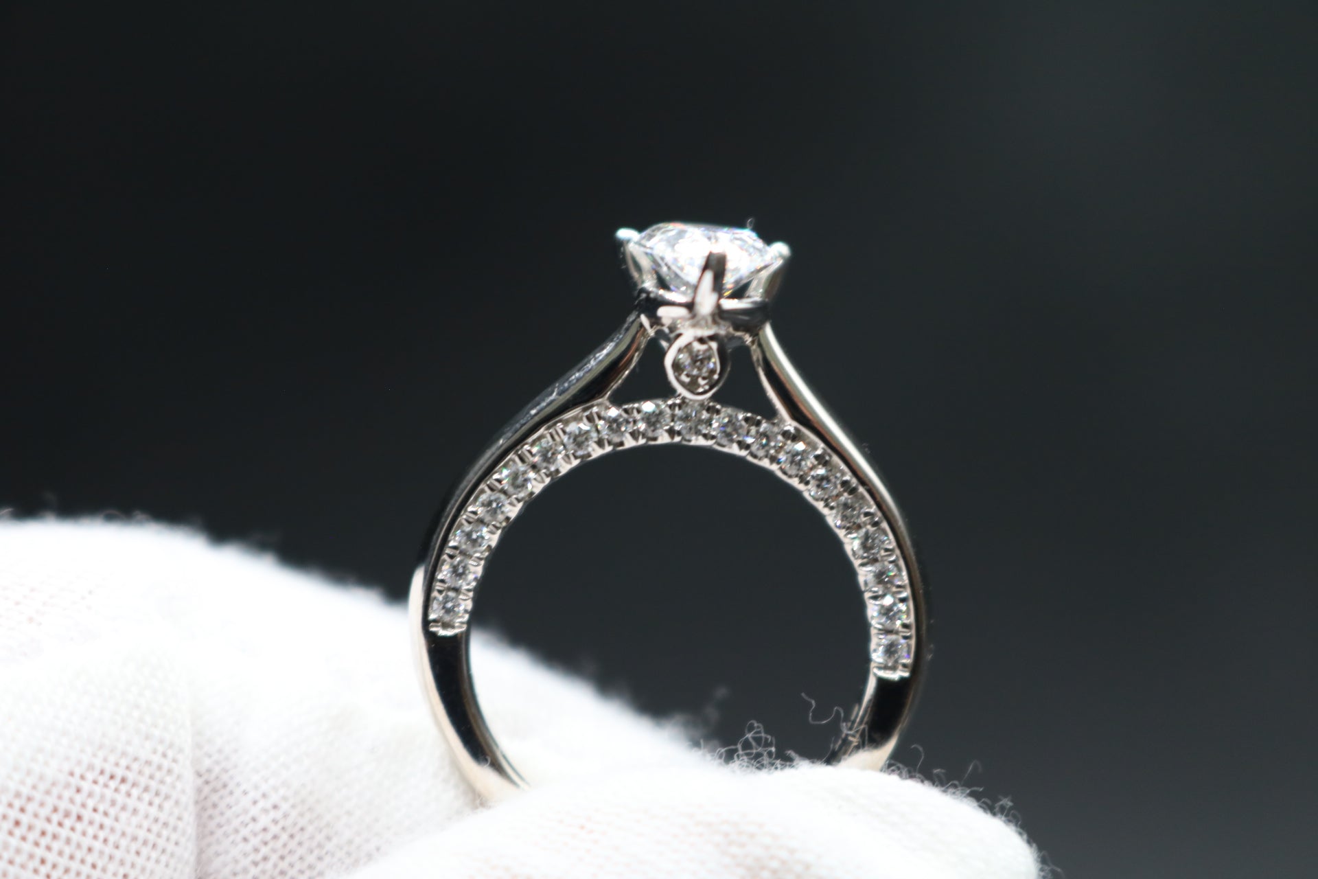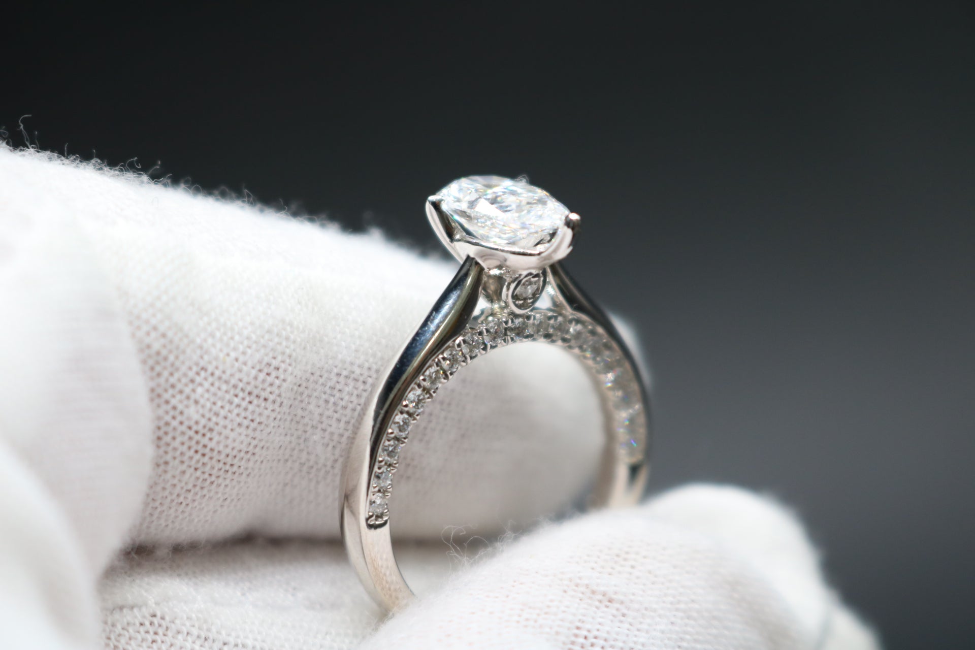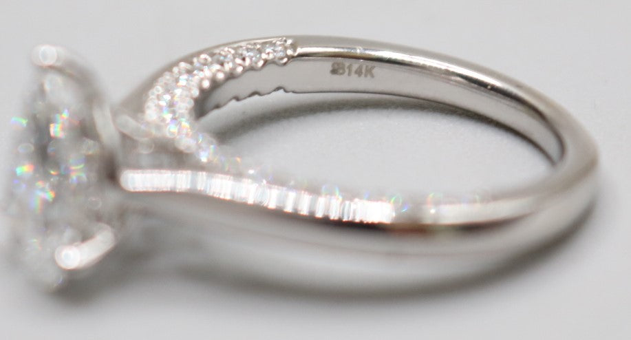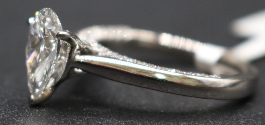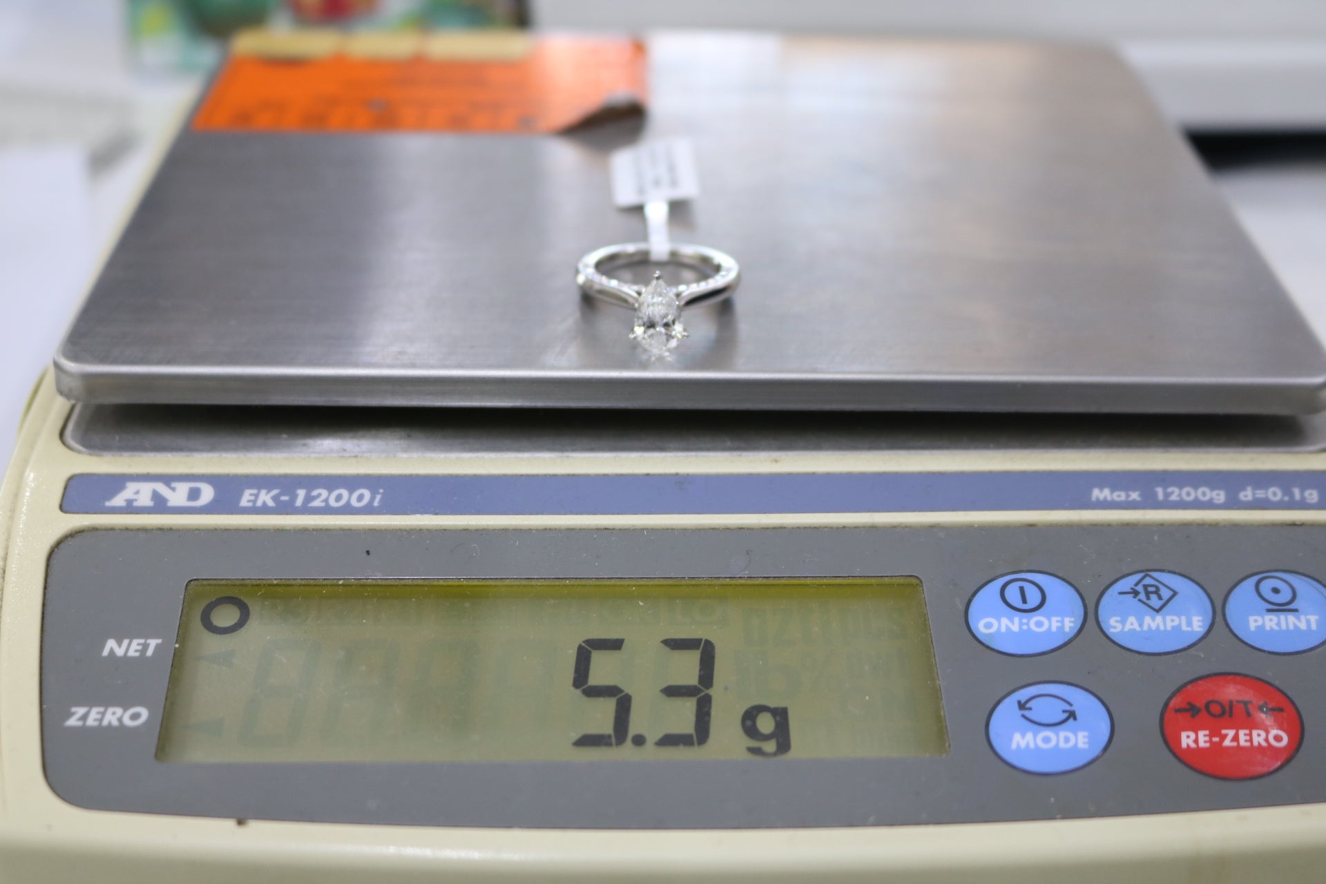 Take a look at this stunning 14K White Gold Lab Grown Diamond Pear-Cut Ring (2.04 CTW) (Size 7) we have for sale! This beautiful ring features 1 pear-cut diamond measuring 1.44 cts and 40 round-cut brilliant diamonds measuring 0.015 cts each. The diamonds boast a color of H-I and a clarity of VVS2. The ring has a weight of 5.3 Grams. Please note that the diamonds on this ring are lab-grown, not natural. This item is available for local pick-up/purchase only. Don't miss the chance to admire this exquisite piece - be sure to check out all the pictures provided!