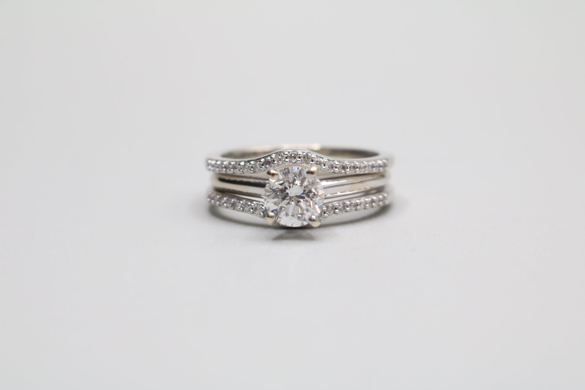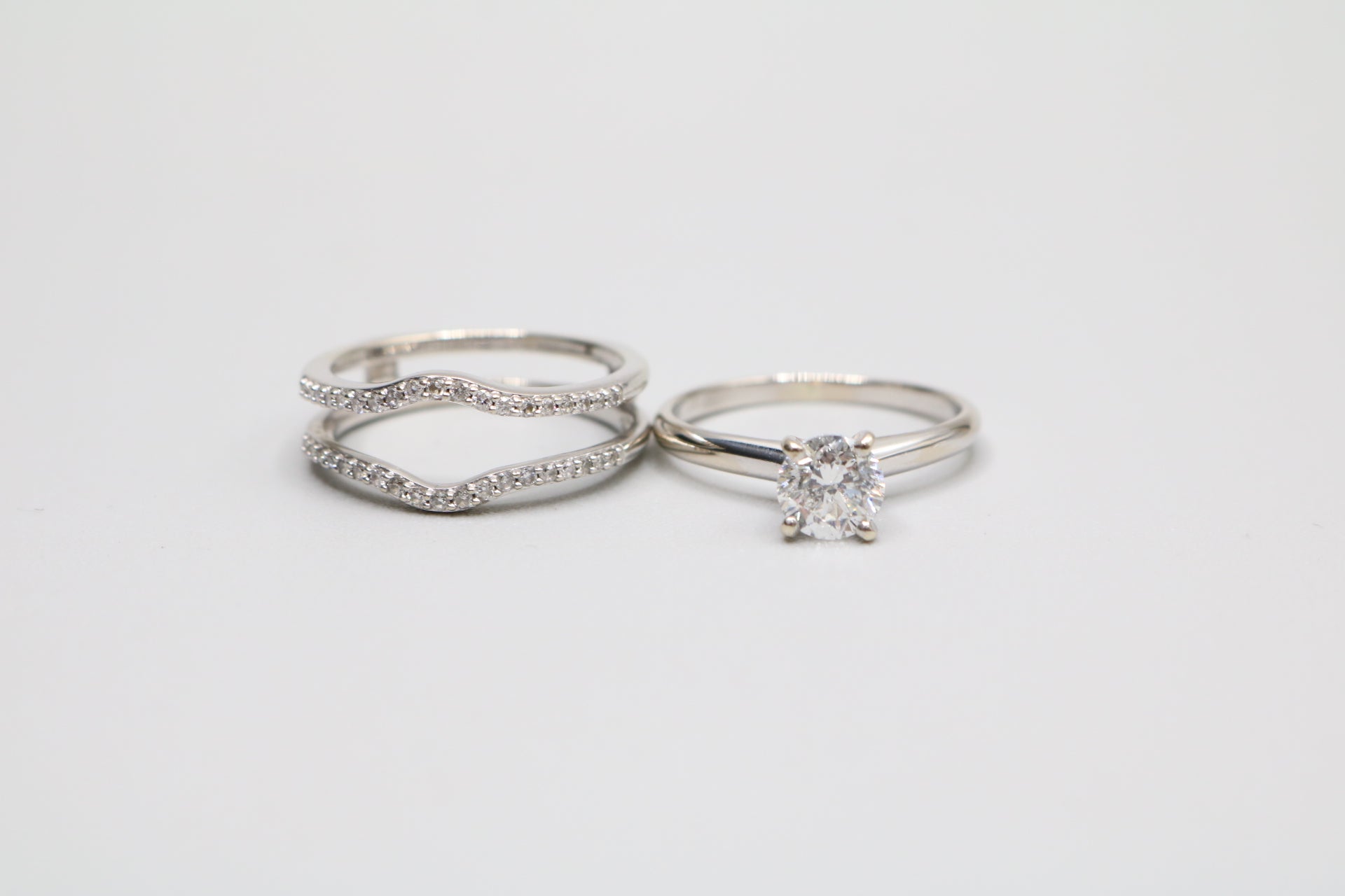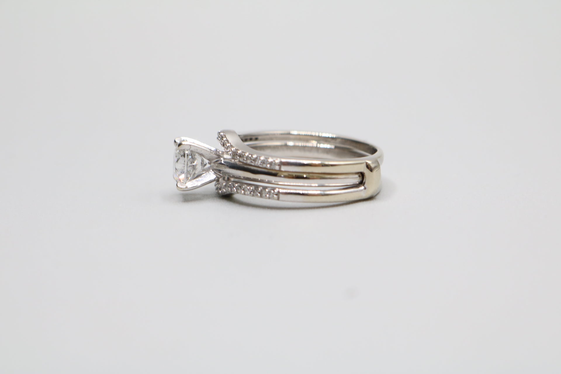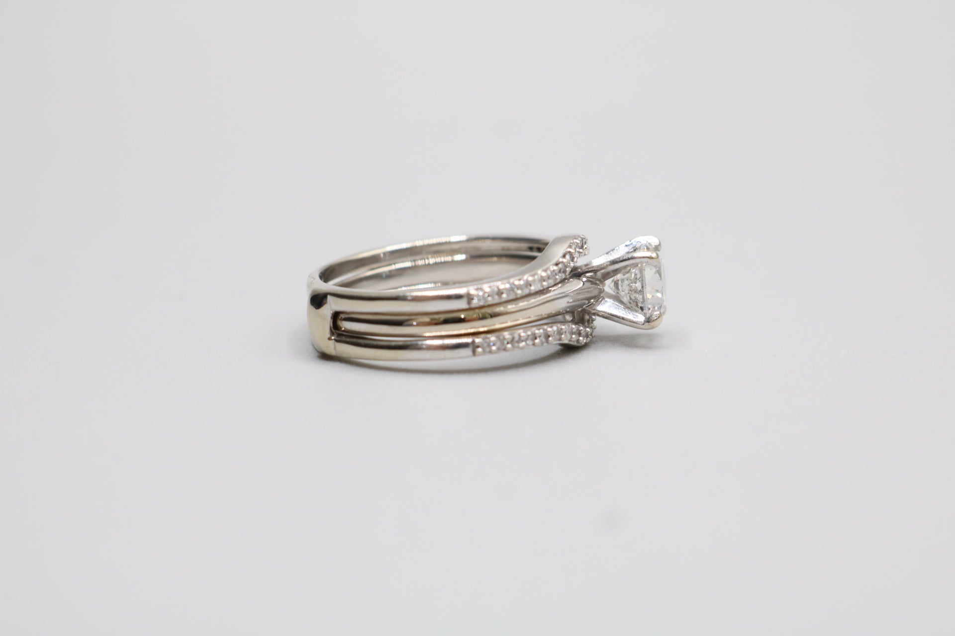 We have a pre-owned 14K White Gold Wedding Ring Set (Size 7 1/2 & 1.24 CTW) available for sale. The ring has been professionally cleaned. The solitaire ring has a single round-cut 0.86 cts diamond with a color of H-I and a clarity of I2-I3. The other ring has 38 round-cut diamonds @ 0.01cts each with a clarity of I2 and a color of H-I. The rings are a size 7 &1/2 and weigh 6.1 grams together. You can purchase the item anytime during regular business hours. Please view all of the pictures that are provided so that you can have a proper understanding of the item you are purchasing. A layaway plan is available with a 30% deposit. For additional information, please contact us. Shipping is not available for this particular item.