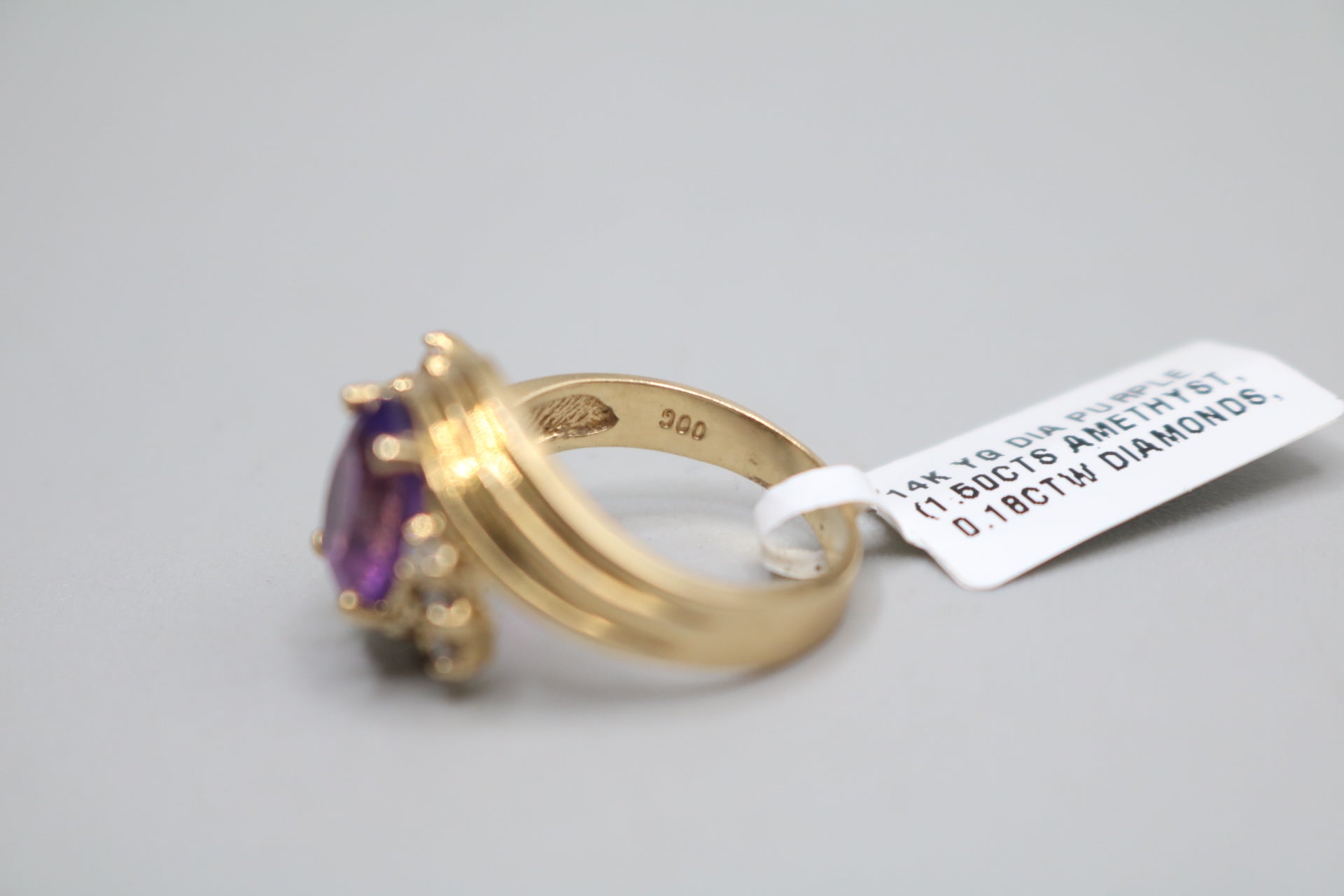 For your consideration, we present a stunning 14K Yellow Gold Diamond Bypass Amethyst Ring, now available for sale. This exquisite piece is in excellent condition, having been professionally cleaned and polished to reveal its true beauty. At the heart of this captivating ring lies a magnificent 1.50-carat Amethyst, embraced by a dazzling arrangement of six round brilliant diamonds, each weighing 0.03 carats, totaling 0.18 carats. The diamonds boast a G-H color grade and clarity of SI1, adding a touch of brilliance to this already striking design. Weighing a delicate 4.9 grams, this size 6 ring exudes elegance and sophistication. We invite you to explore all the images provided to fully appreciate the craftsmanship and allure of this remarkable piece. For your convenience, we offer a layaway plan with a 30% deposit, making it easier to make this treasure yours. Should you have any questions or require further information, please do not hesitate to reach out. You are welcome to pick up the item during regular business hours, or we can arrange for safe shipping that includes tracking information for your peace of mind. Don’t miss the opportunity to own this extraordinary ring!