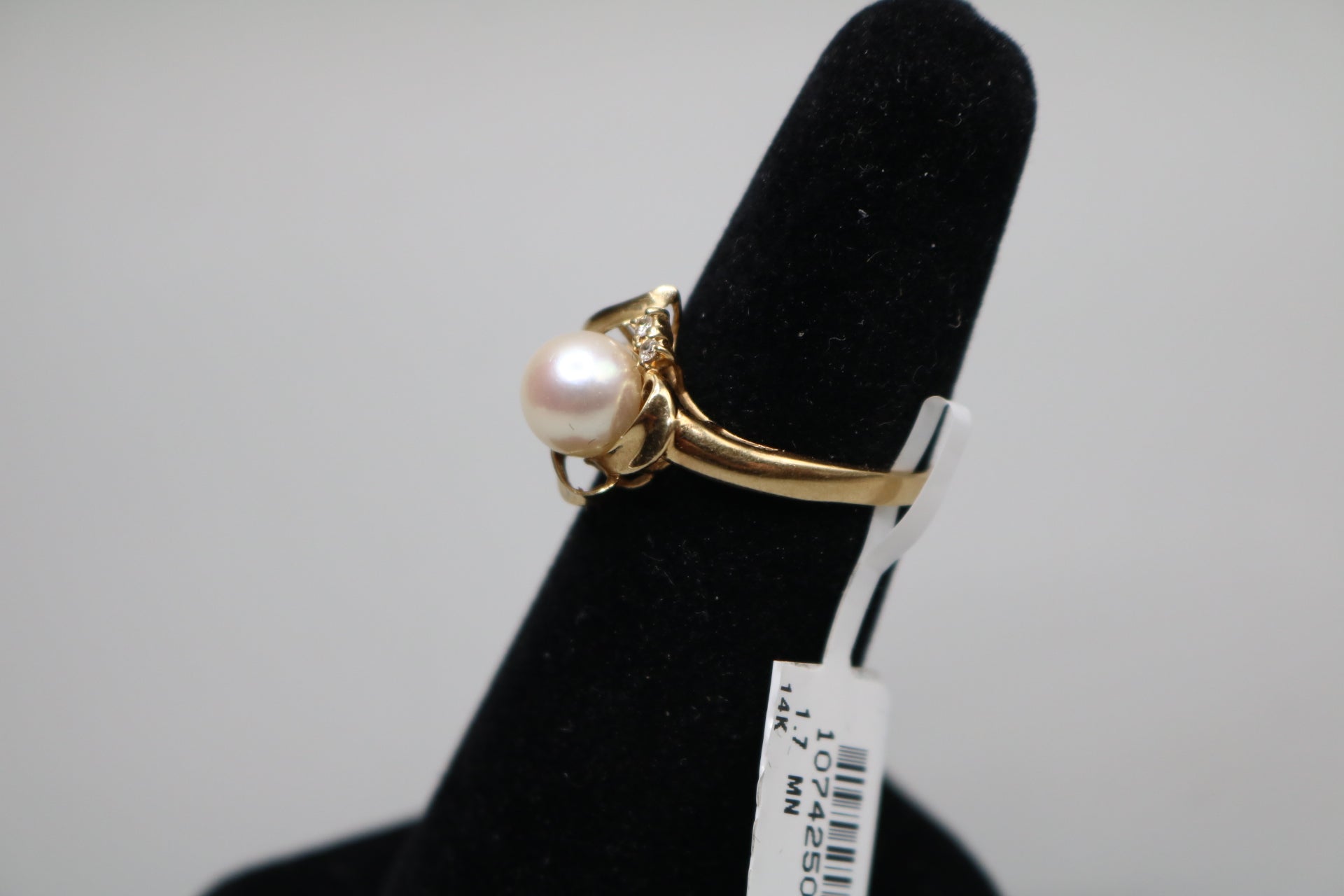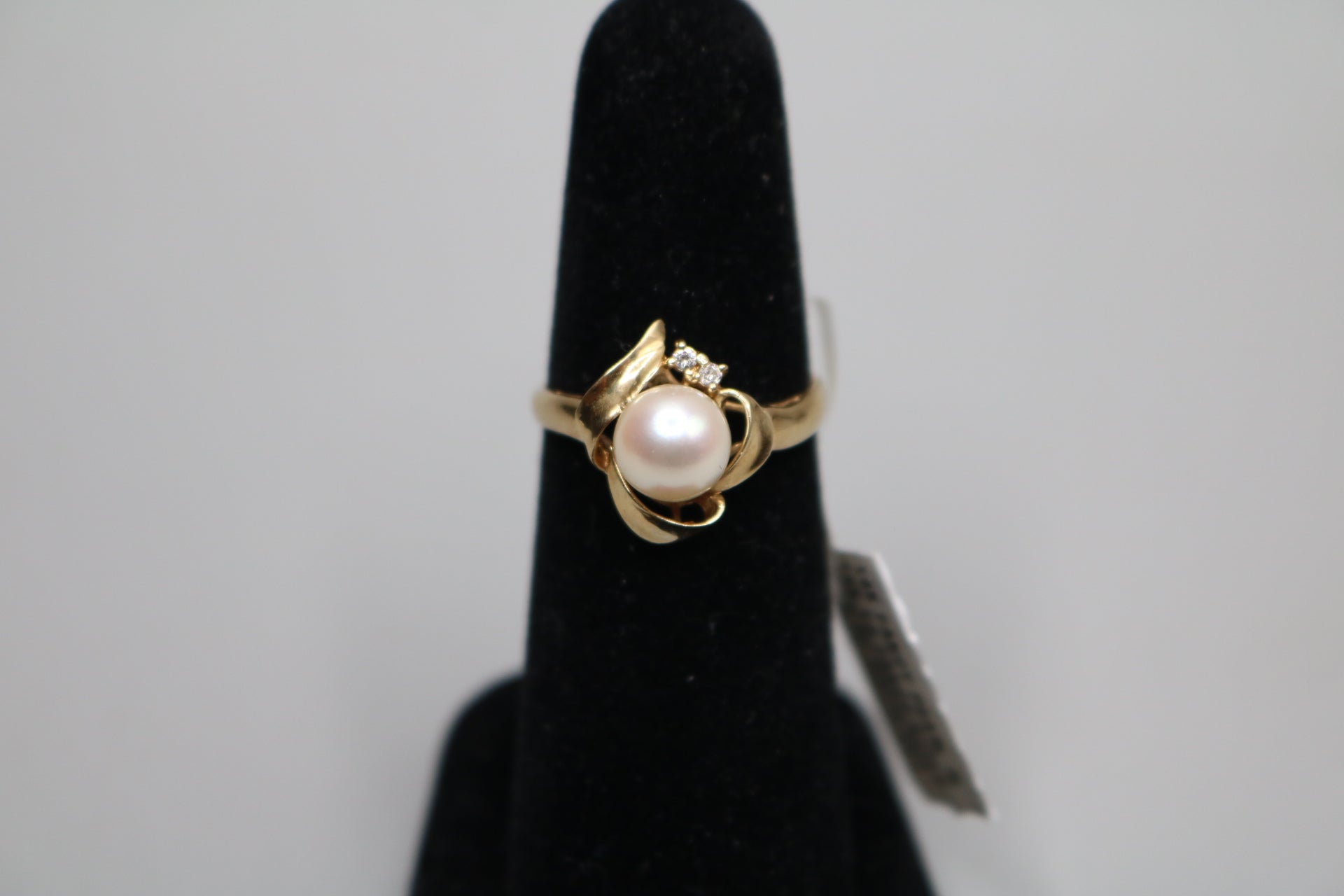 Take a look at this stunning 14K Yellow Gold Fancy Vintage Pearl Diamond Ring (Size 7 3/4) up for sale. The ring has been professionally cleaned and polished, and it features a Vintage Pearl at the center with 2 round brilliant diamond chips on top. This size 7 ring weighs 2.7 grams. Check out the pictures for more details. We also offer a layaway plan with a 30% deposit. For additional information, please contact us. You can pick up the item anytime during regular business hours, or you can get it shipped to you, and shipping will include tracking information and insurance.
