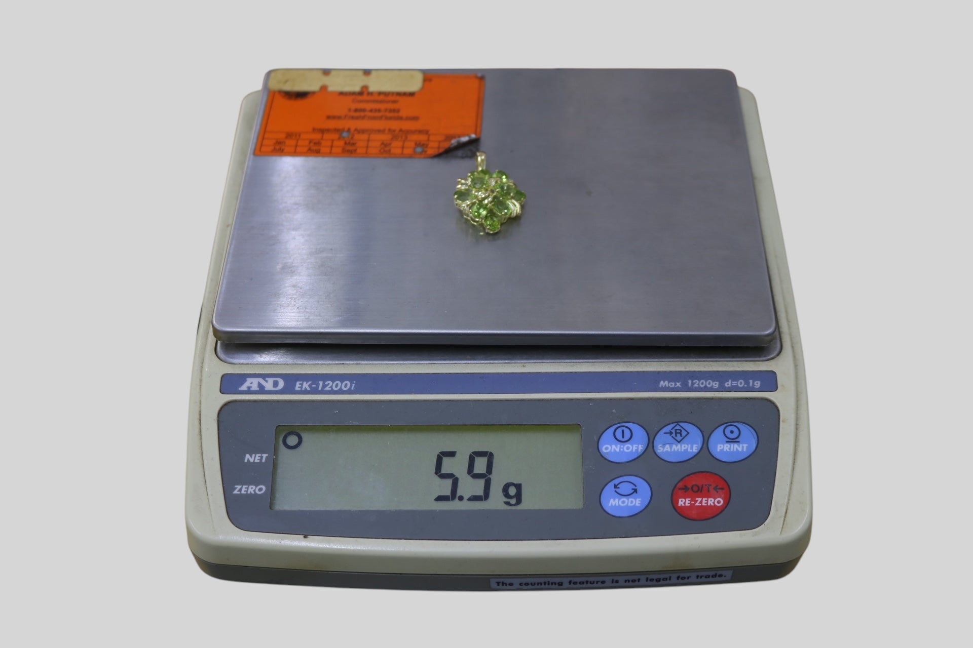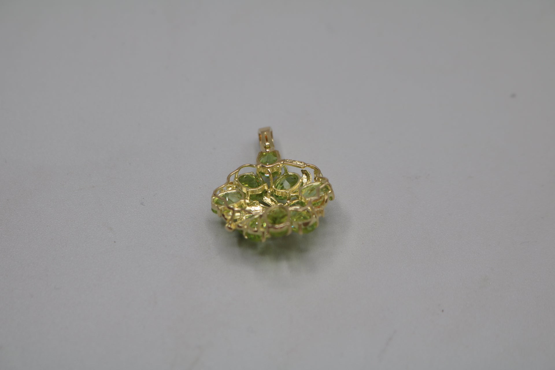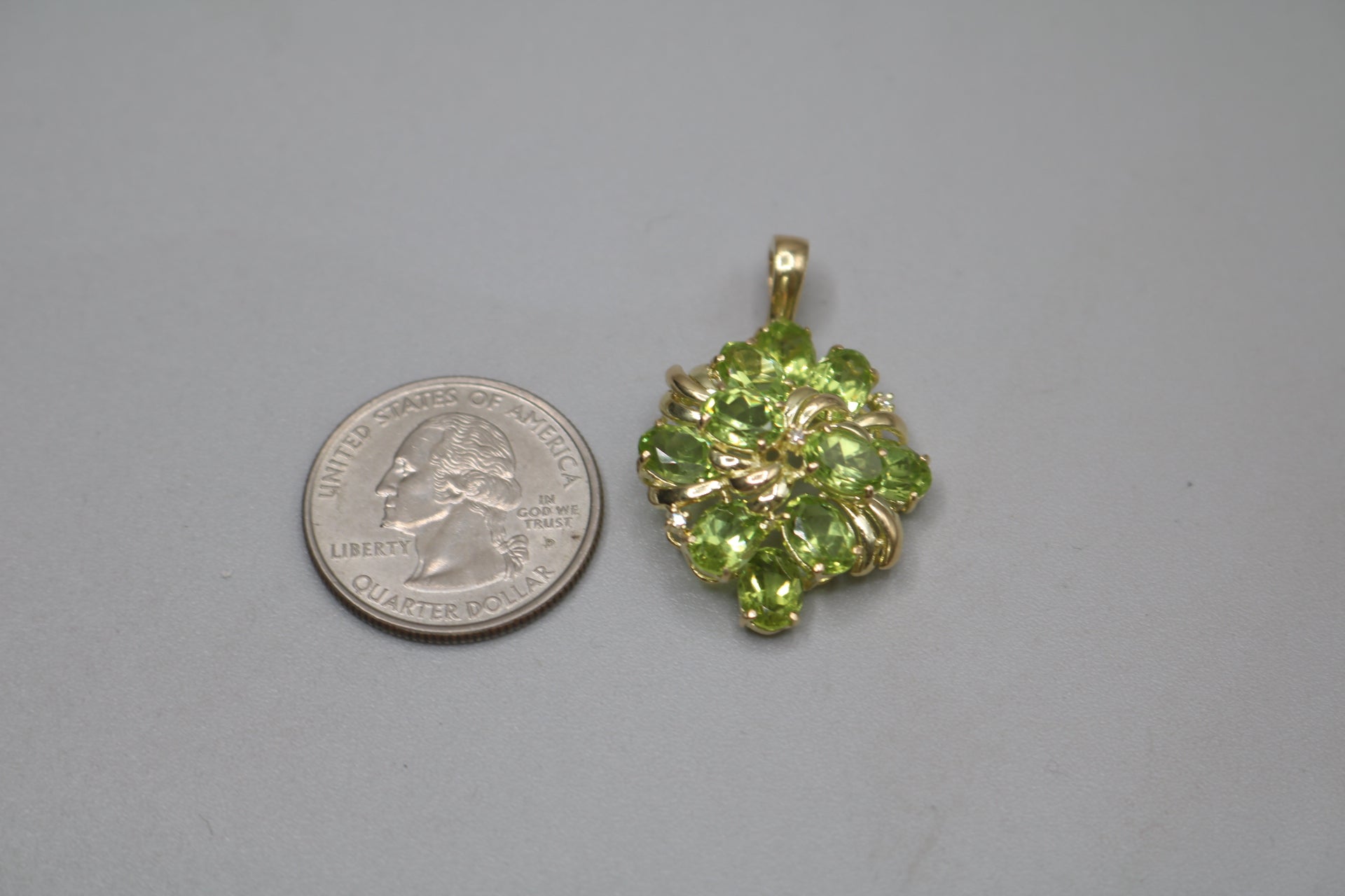 Check out this stunning pre-owned 14K Yellow Gold Green Tourmaline Charm. The charm has 10 oval-cut green tourmalines and 3 round-cut diamonds @ 0.005cts each. It weighs 5.9 grams. The charm is also available to put on layaway with a 30% deposit, contact us for further details. Purchase in-store during regular business hours or online with shipping that includes tracking information. Be sure to examine the pictures for all the cosmetic details before making your purchase.