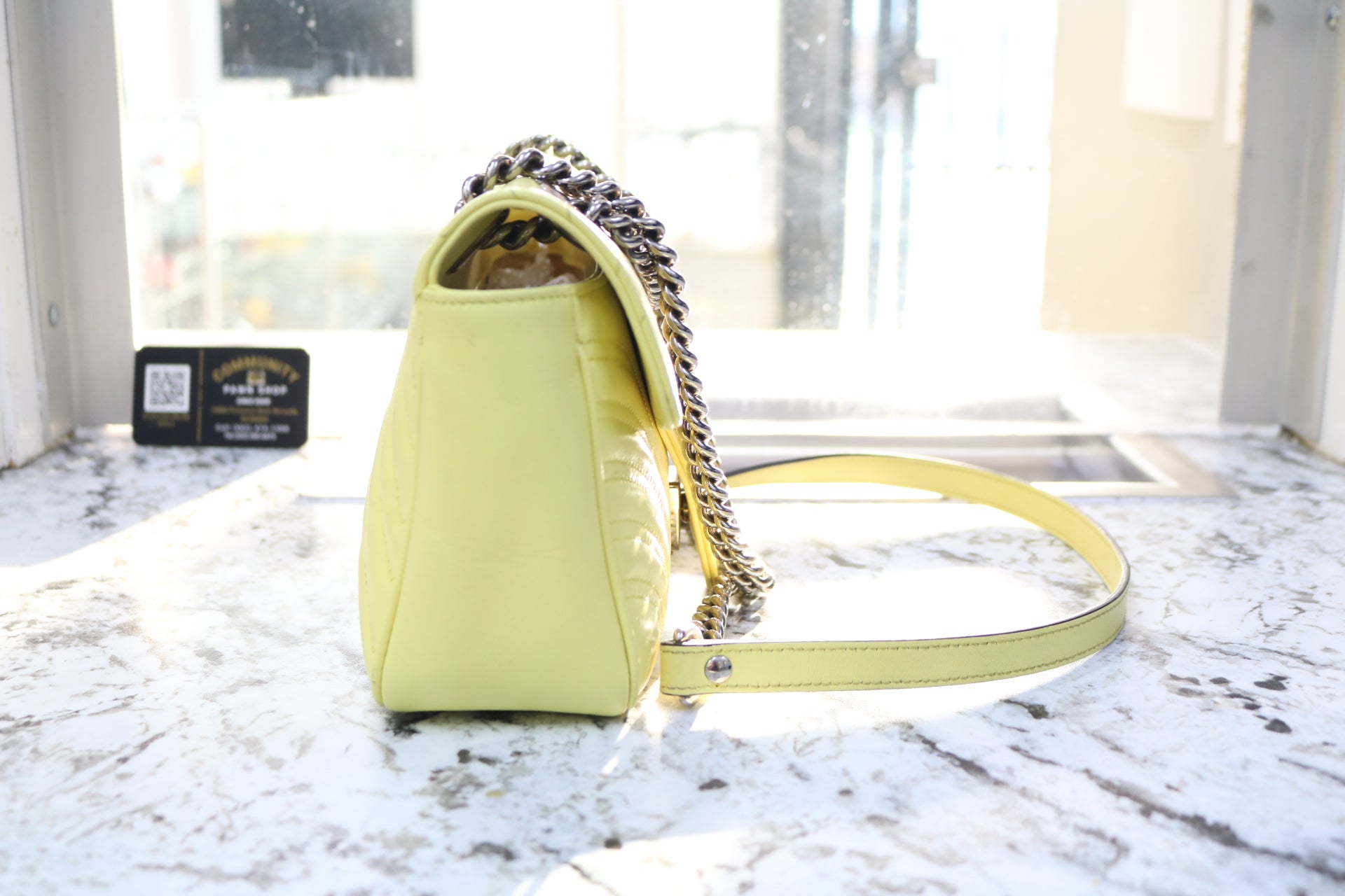 Up for sale, we have a pre-owned Gucci Quilted Matelasse GG Marmont Yellow Bag. The item is in good cosmetic condition. Previous use has left signs of wear, such as creases and stains. The bag's measurements are 3" (length), 6" (height), and 10" (width). This listing is for the item with a Legitapp authentication certificate. The bag comes with no other accessories aside from those in the photo. Please view all of the pictures that are provided so that you can have a proper understanding of the item you are purchasing. Thank you. A layaway plan is available with a 30% deposit. Shipping comes with tracking information.
