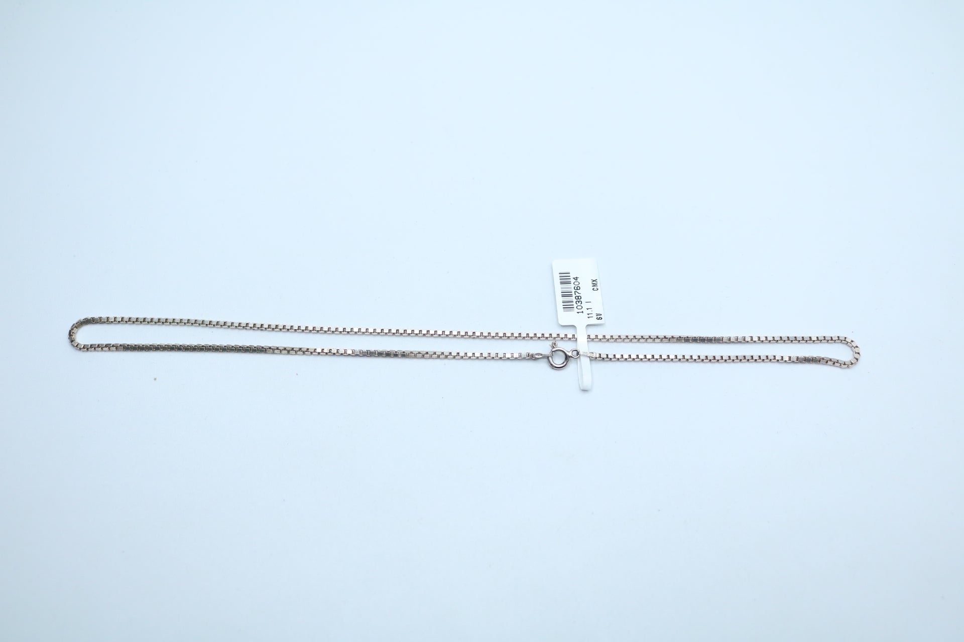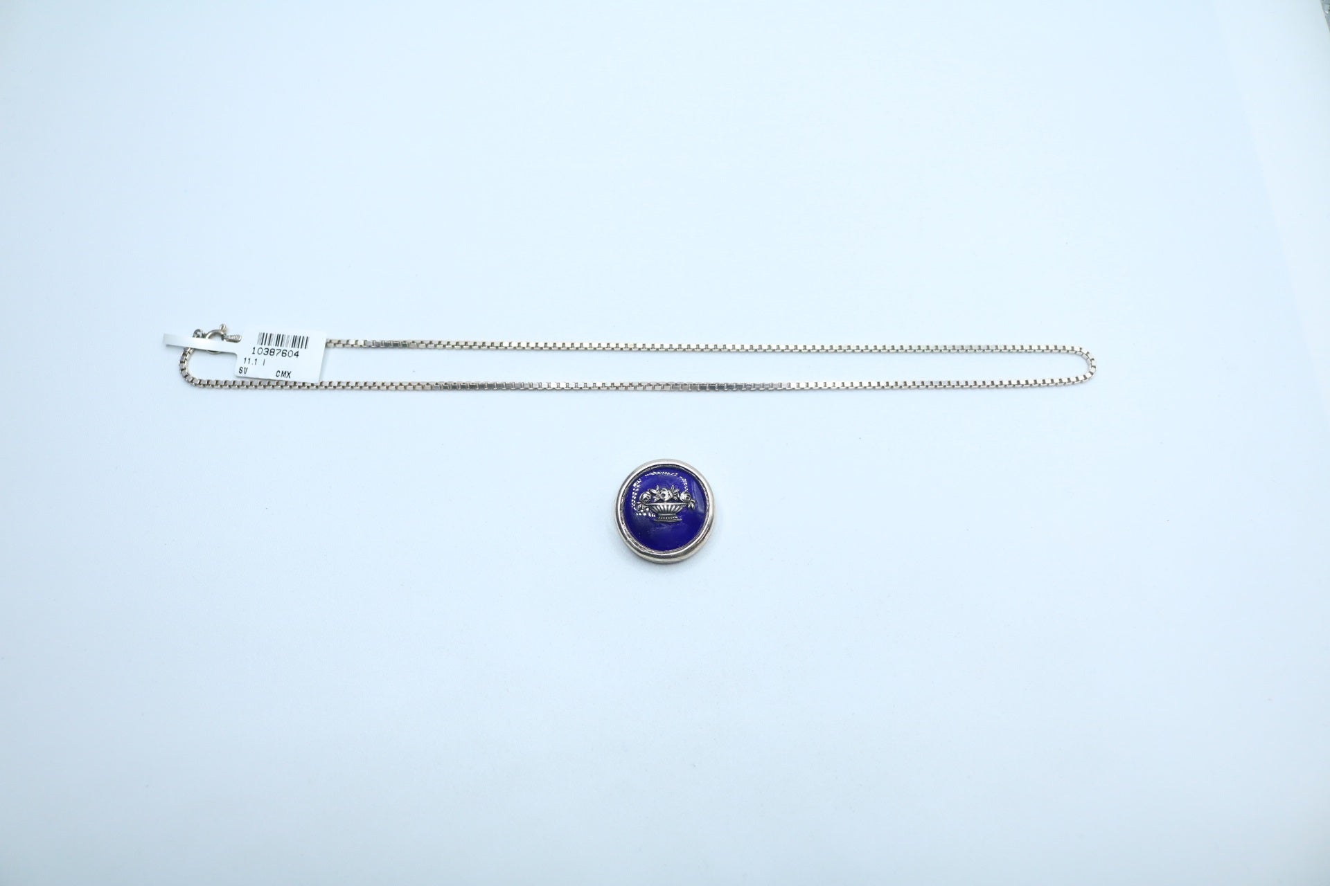Pre-owned Sterling Silver Box Chain with Round Charm. The chain has been professionally cleaned and polished. The chain has a weight of 16.9 grams. This particular chain is a box chain with a blue round flower charm and is measured at 18 inches. Please view all of the pictures that are provided so that you can have a proper understanding of the item you are purchasing. Thank you. Layaway plan is available with a 30% deposit.