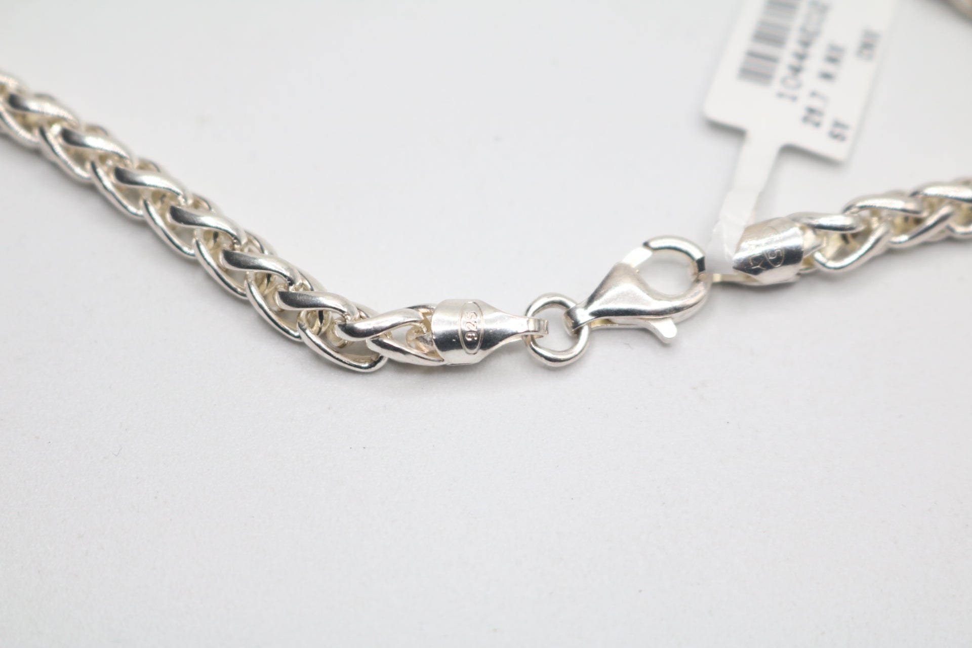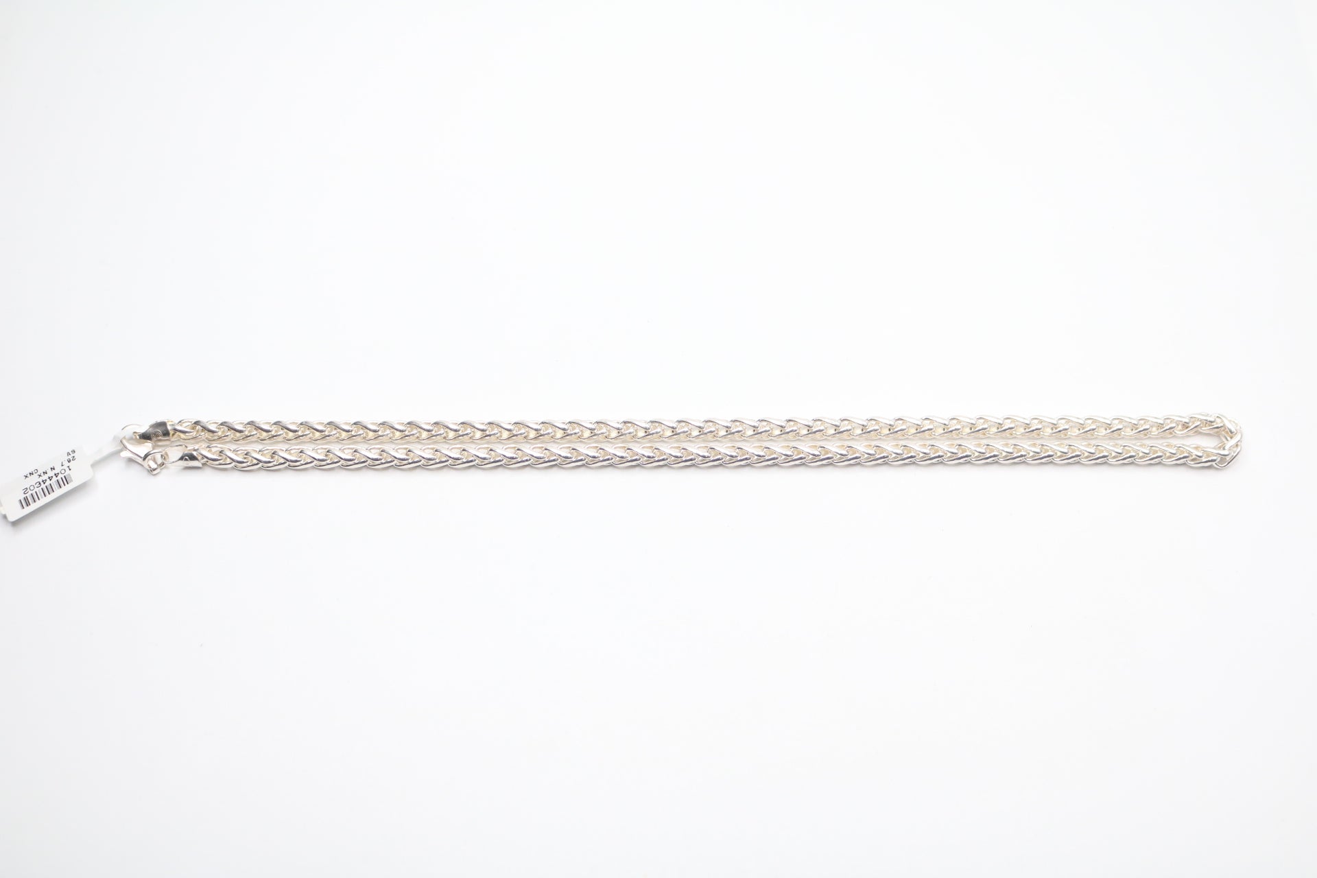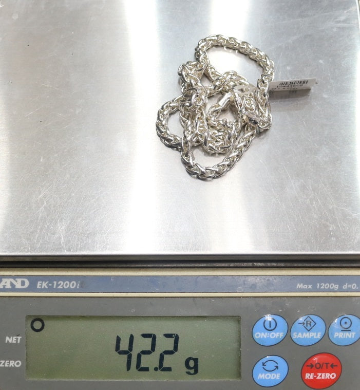 Pre-owned Sterling Silver Spiga Chain. The chain has been professionally cleaned and polished. The chain has a weight of 42.2 grams. This particular chain is a Spiga design and is measured at 19 inches. Please view all of the pictures that are provided so that you can have a proper understanding of the item you are purchasing. Thank you. Layaway plan is available with a 30% deposit.