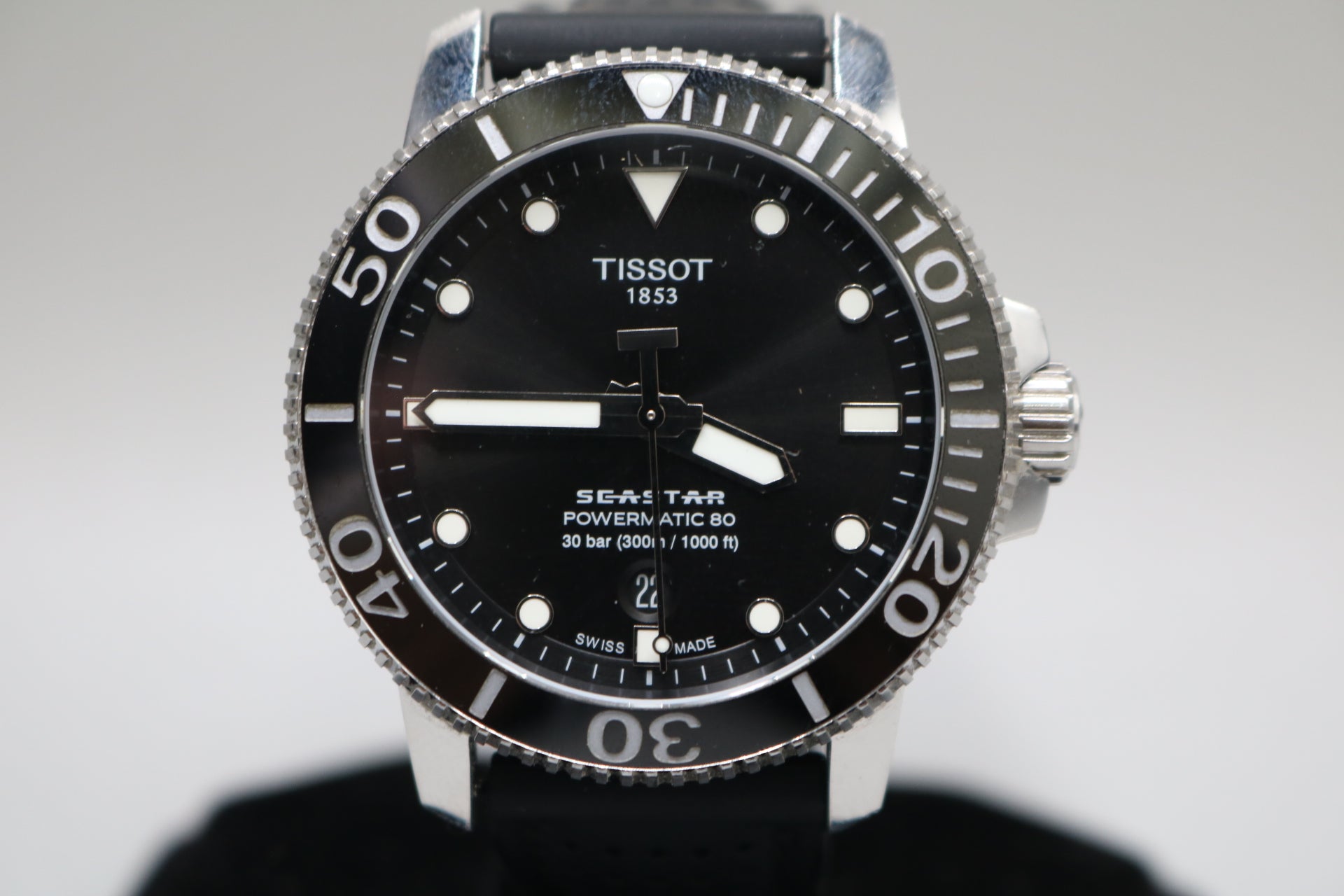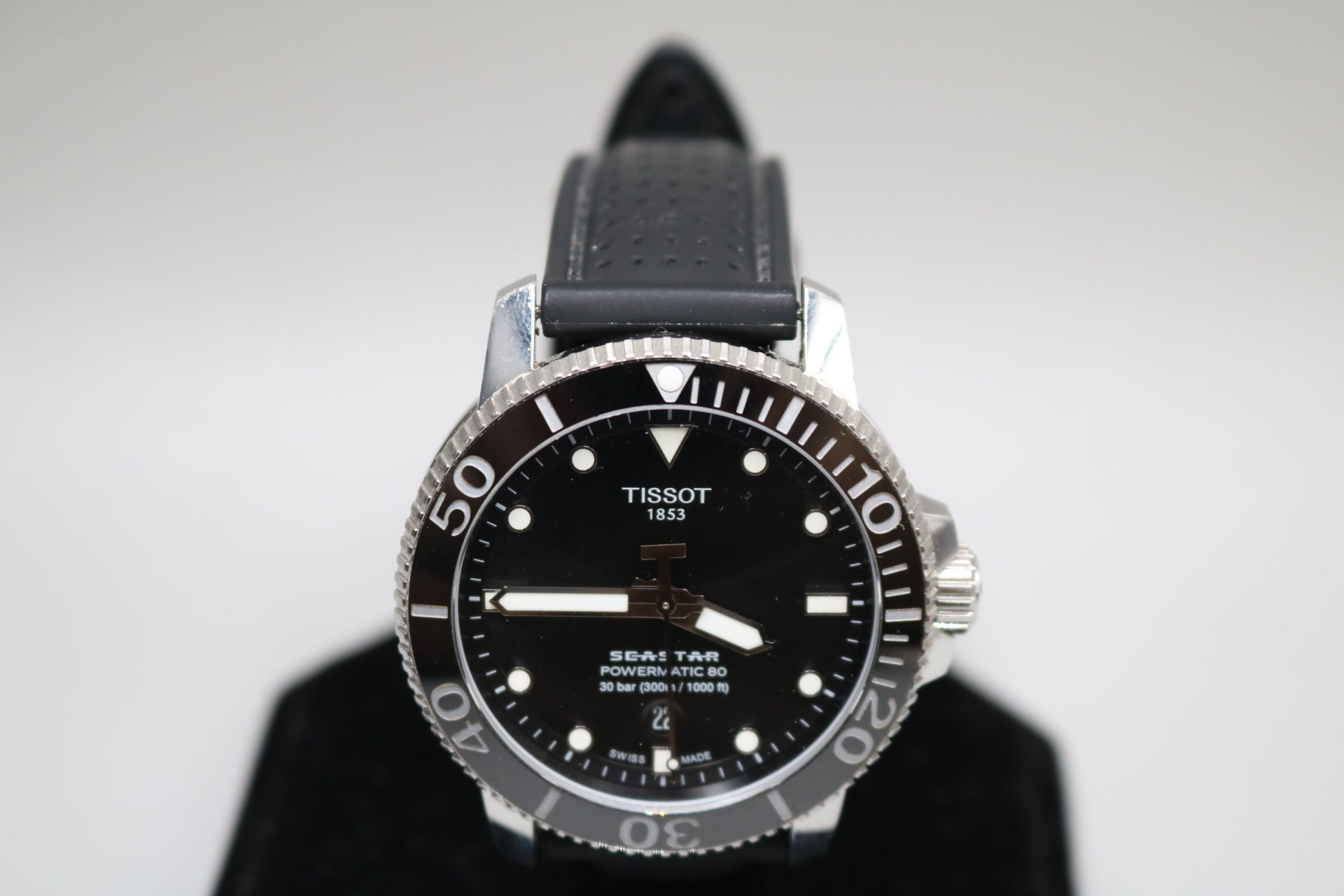 Up for sale, we have a secondhand Tissot Seastar 1000 Men's Black Watch - T120.407.17.051.00 that is in good working and good cosmetic condition. The watch has some minor scratches, but these do not affect the performance of the item. The watch comes with no accessories and has a aftermarket band, no original band. Please view all of the pictures that are provided so that you can get a better understanding of the item you are purchasing. Thank you. A layaway plan is available with a 30% deposit. You can pick up the item anytime during regular business hours, or you can get it shipped to you, and shipping will include tracking information.